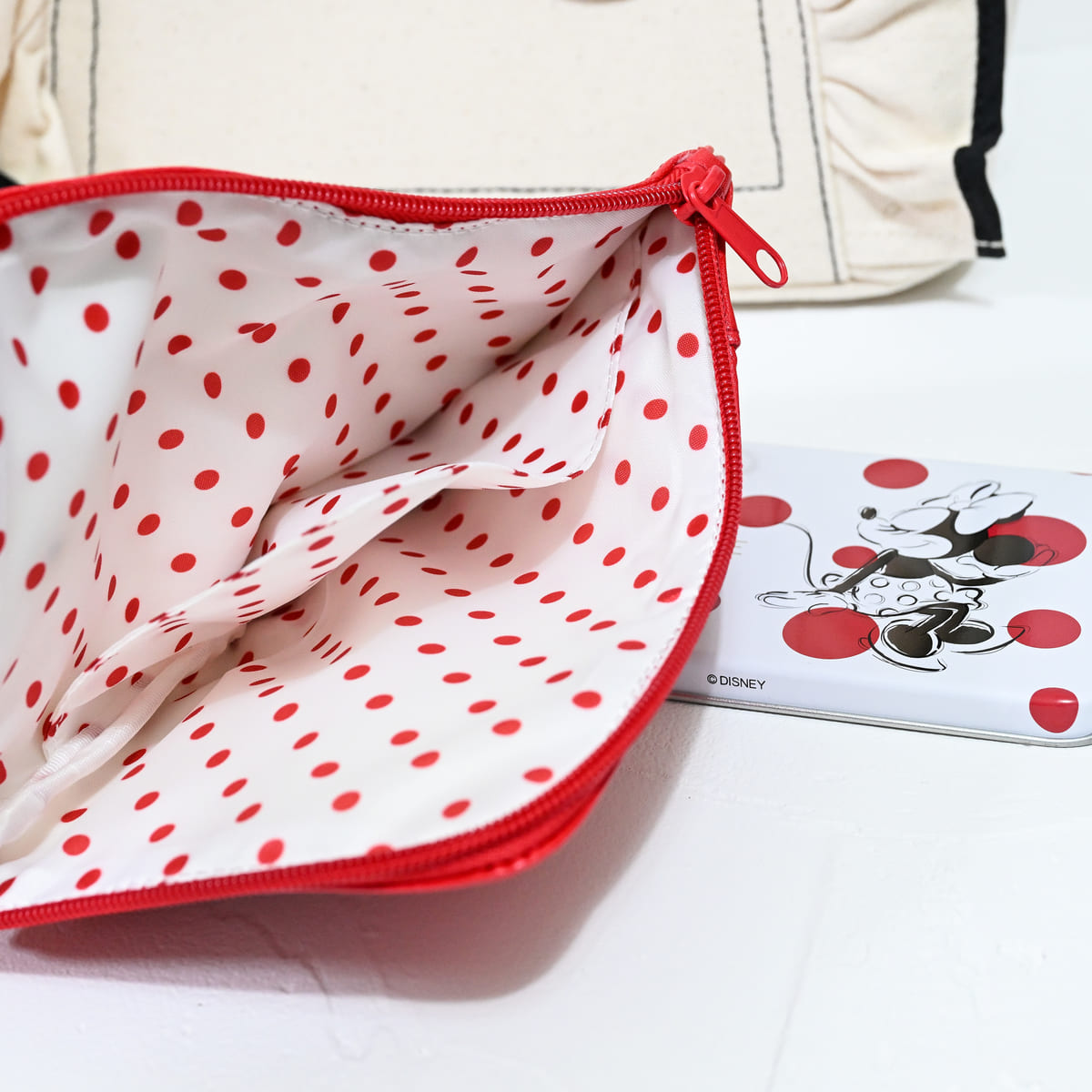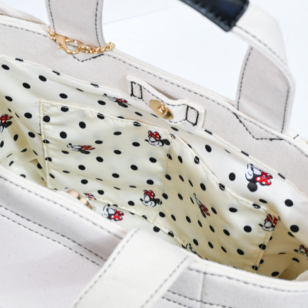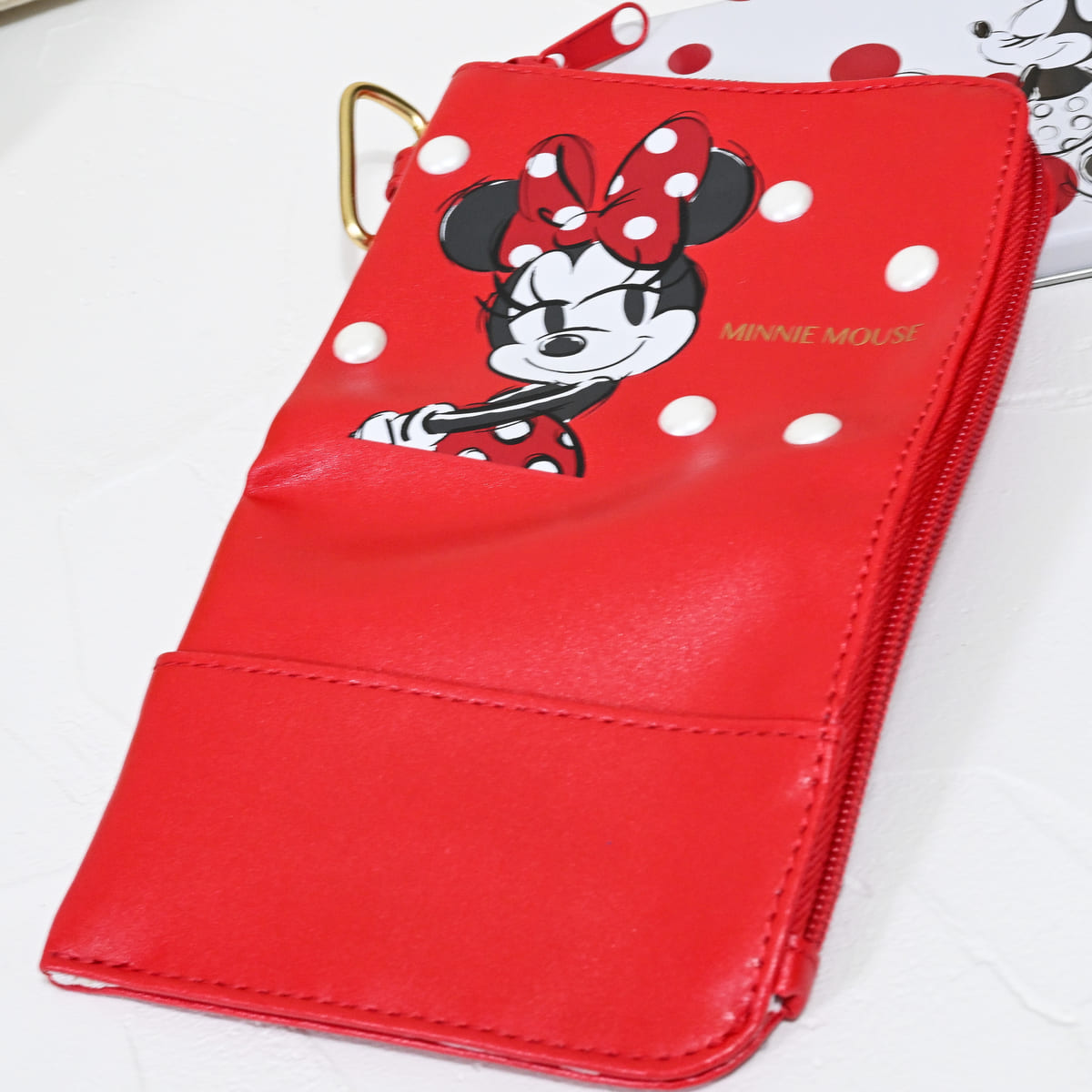 内側にはドットと「ミニーマウス」の横顔が総柄でデザインされています。