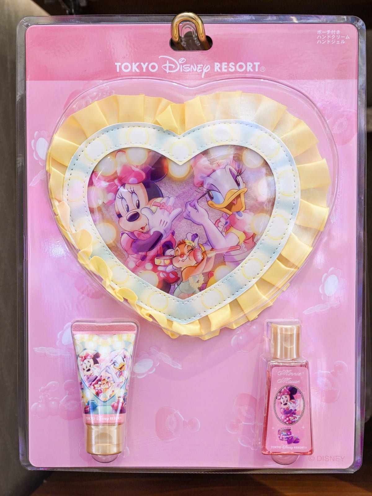 ミニーの家のドレッサーでおめかしするミニーマウスたちをデザインしたハート型のポーチやハンドクリーム、ハンドジェルのセット。