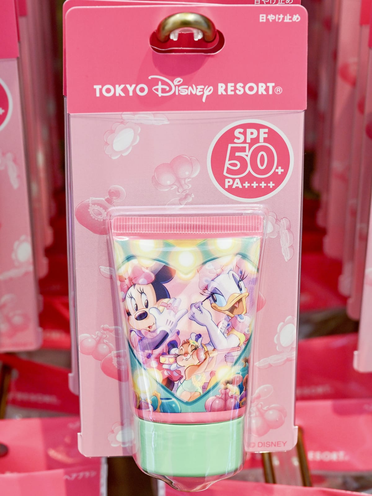 お化粧をするミニーマウス、デイジーダック、クラリスがデザインされた日焼け止め。