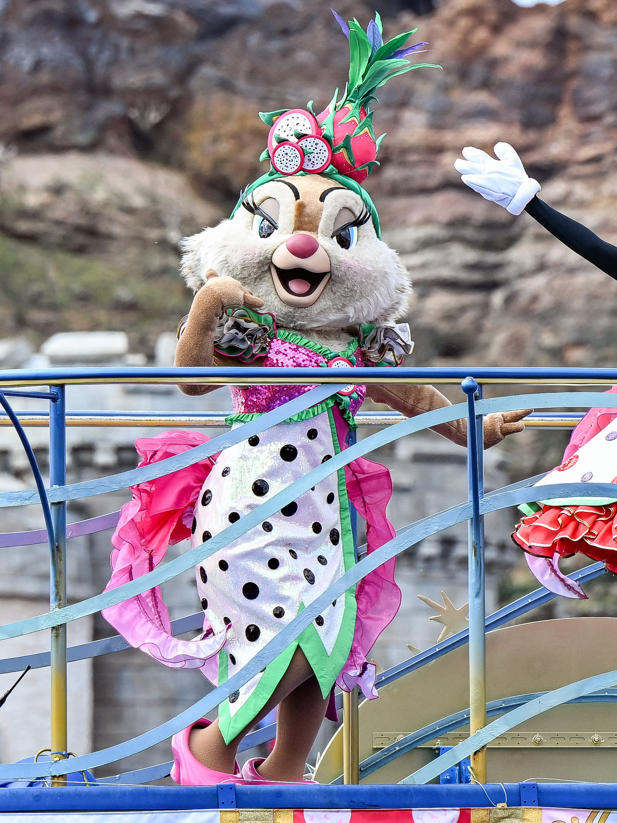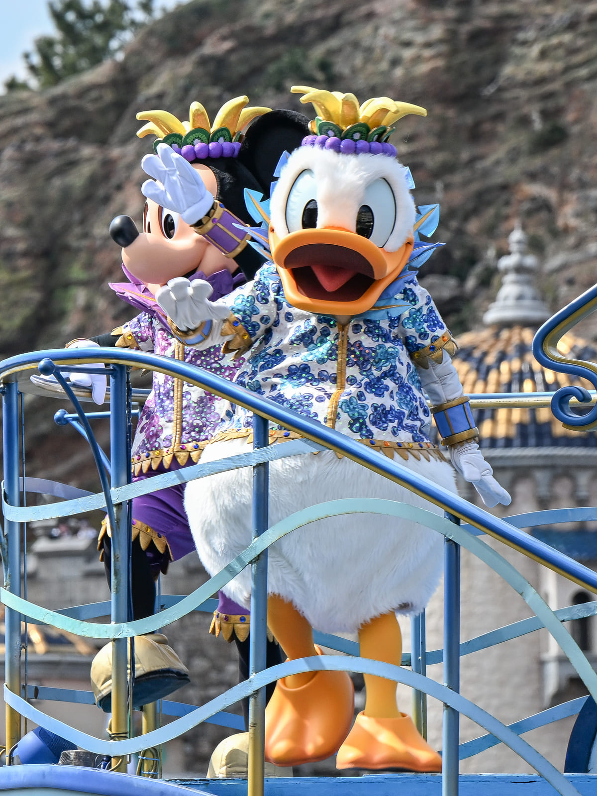 そんな「ミニーのトロピカルスプラッシュ」の音楽やコスチュームでミニーマウスたちがご挨拶に登場!