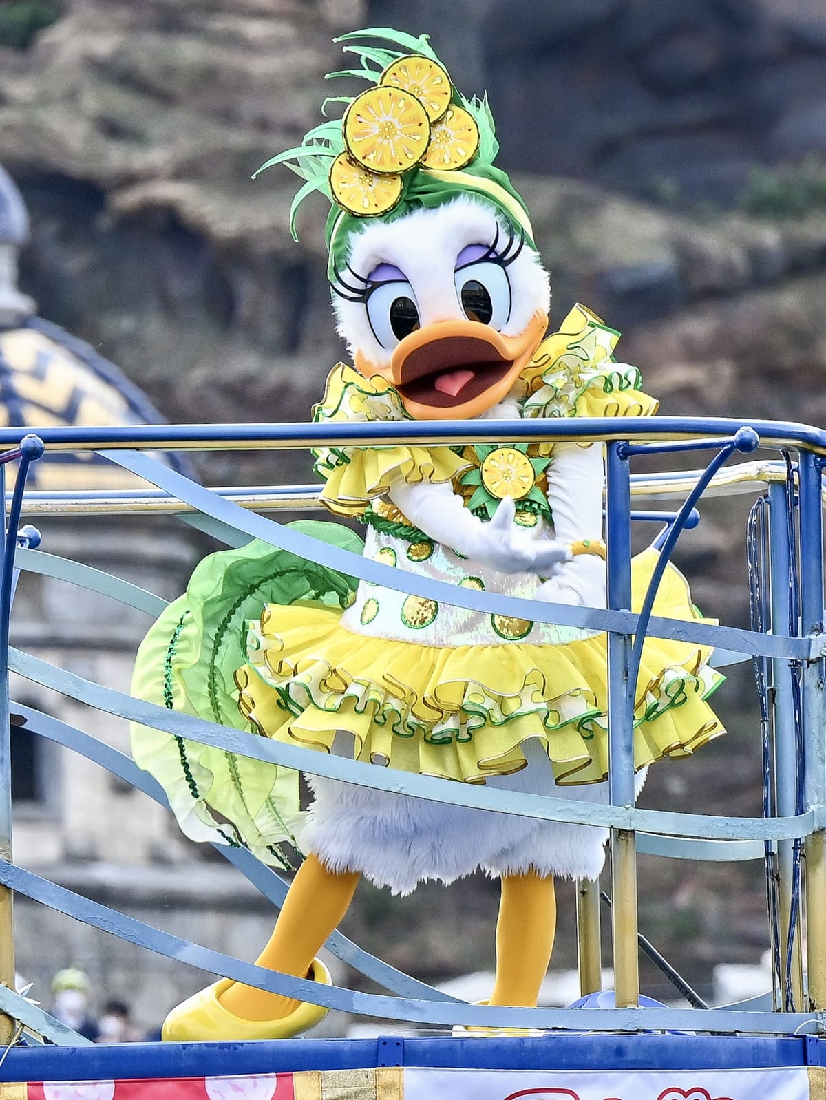 カーニバルクイーンに扮したミニーマウス、デイジーダック、クラリスたちがフルーツの豊作をお祝いする夏の名物ウォータープログラム!
