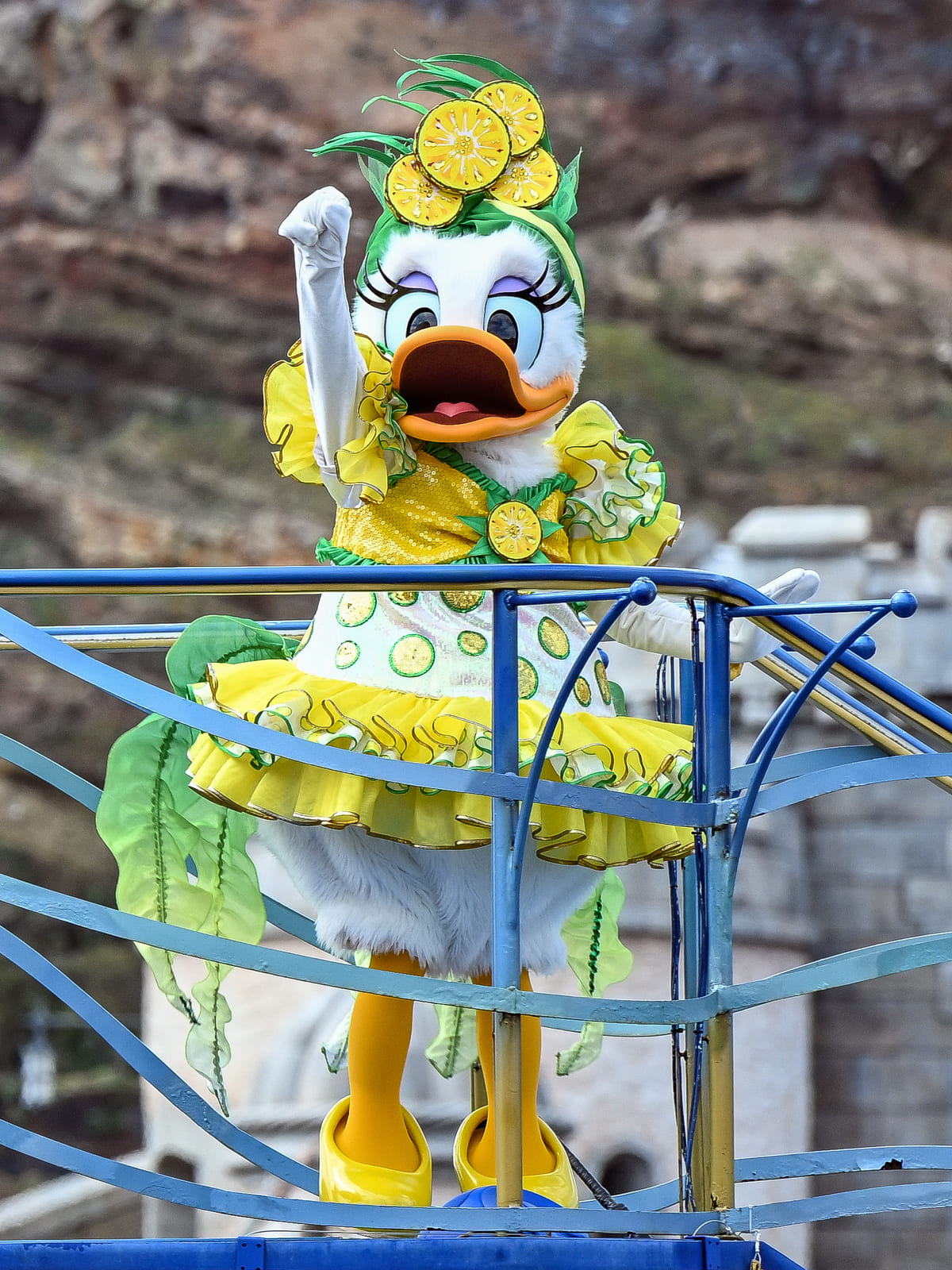 ドナルドダックは、ブルーベリーをモチーフにしたコスチューム。