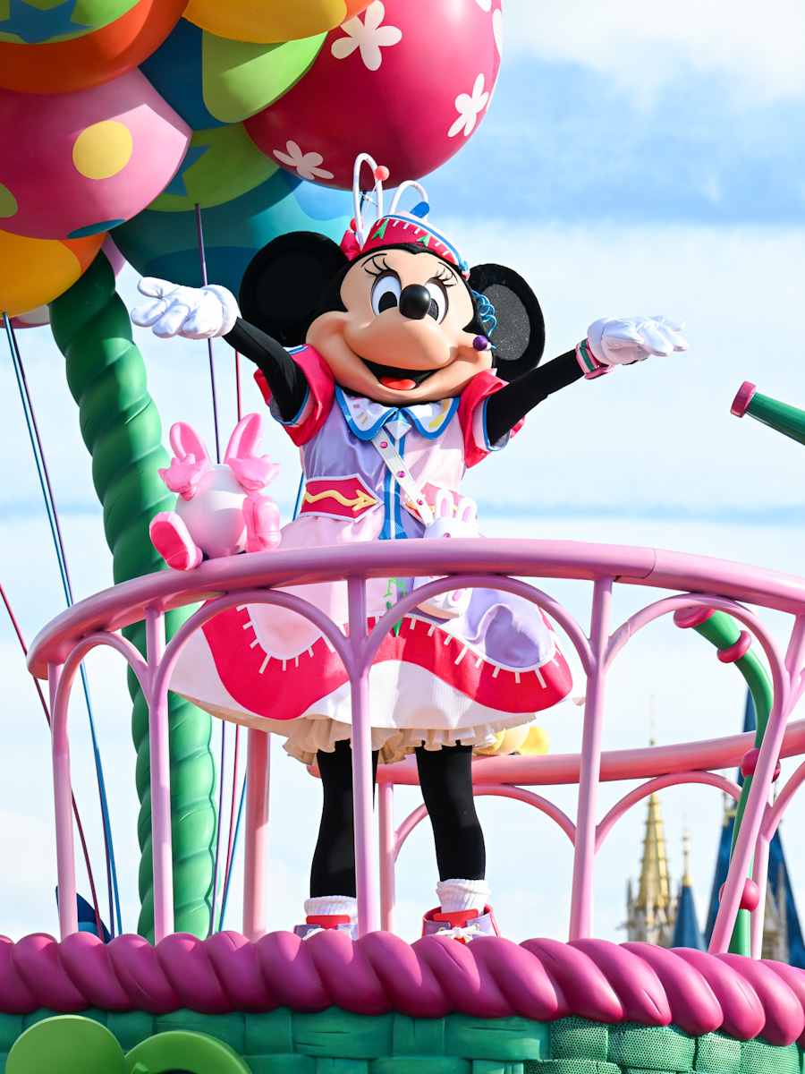 ディズニーの仲間たちと、ウサギの耳がついたタマゴのキャラクター“うさたま”がドタバタ大騒動を繰り広げるヘンテコ楽しいパレード「うさたま大脱走!」を、過年度と一部内容を変更して公演中。