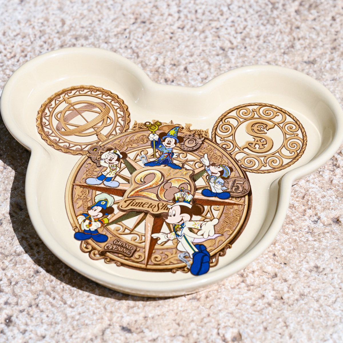 東京ディズニーシーのグランドオープニング、5周年、10周年、15周年、そして20周年のコスチューム姿のミッキーマウスたちがデザインされたスーベニアカップ、プレート付きのデザート。