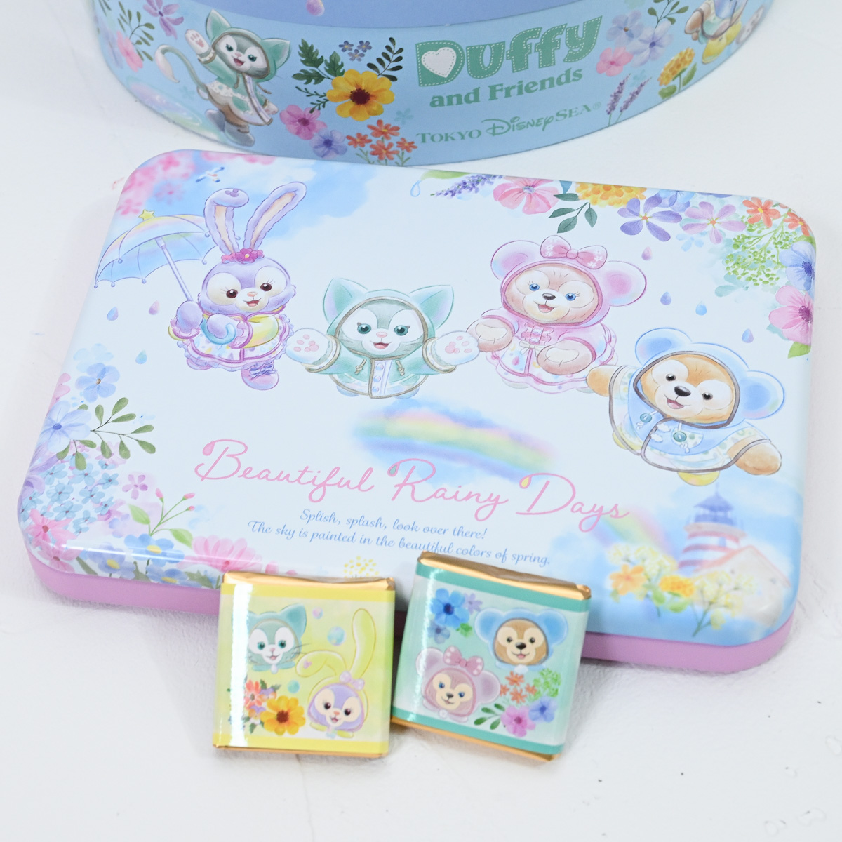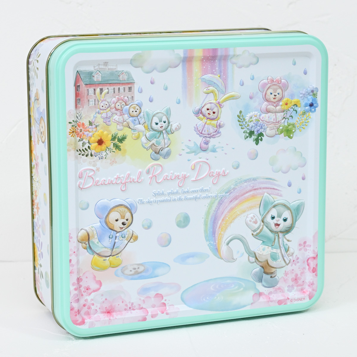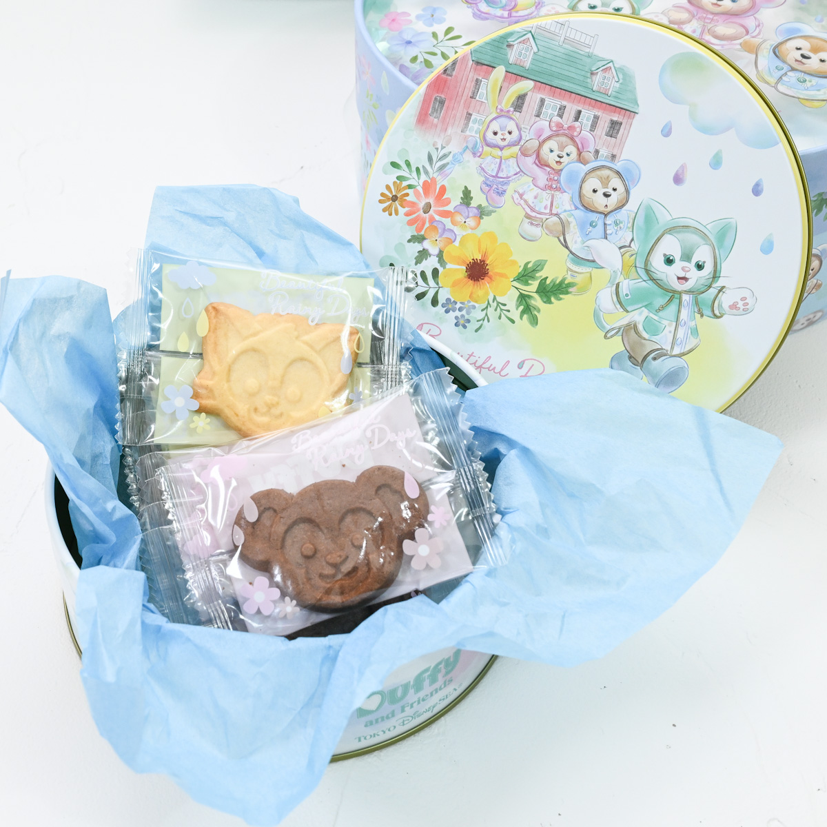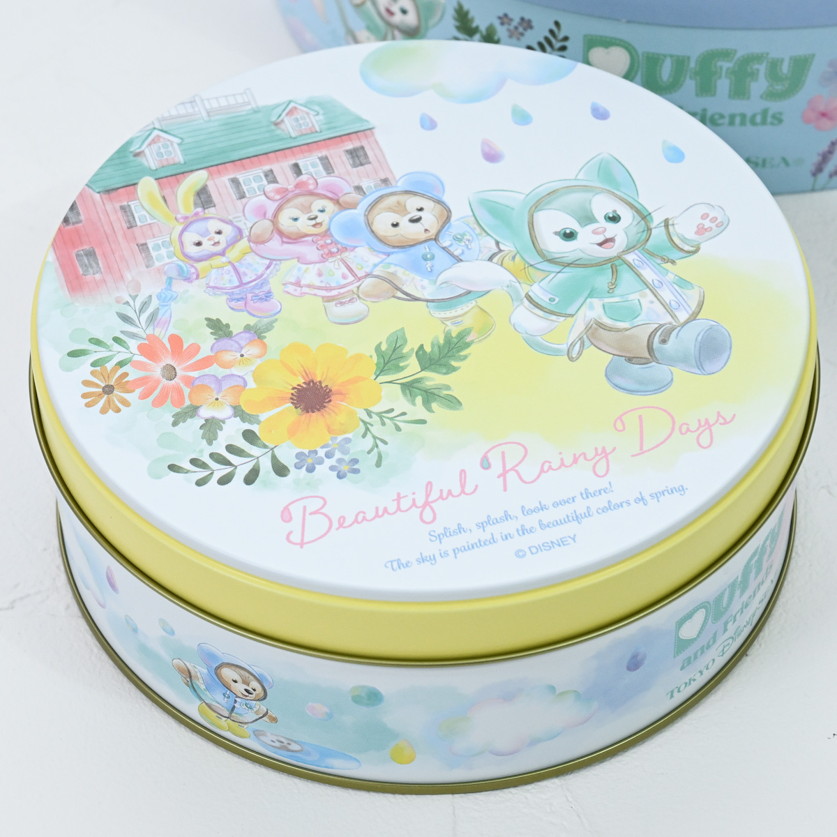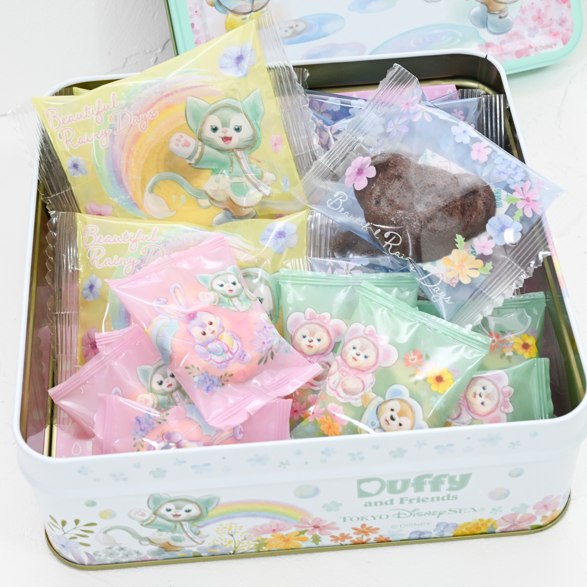 レインウェア姿のダッフィーたちがちょこっと立体的にデザインされた缶入りのお菓子詰め合わせ。