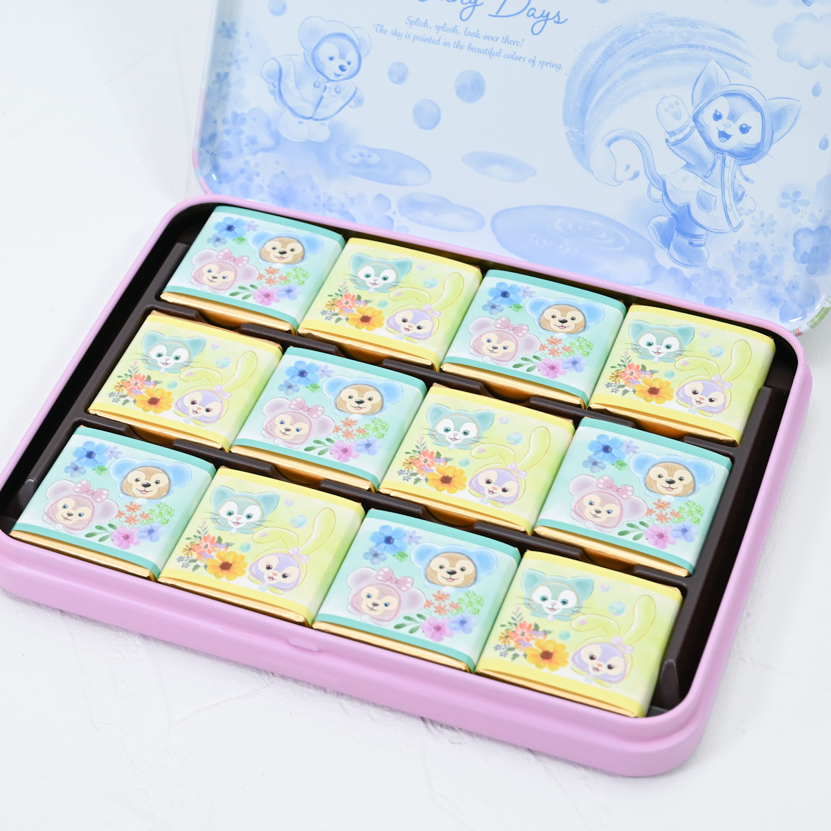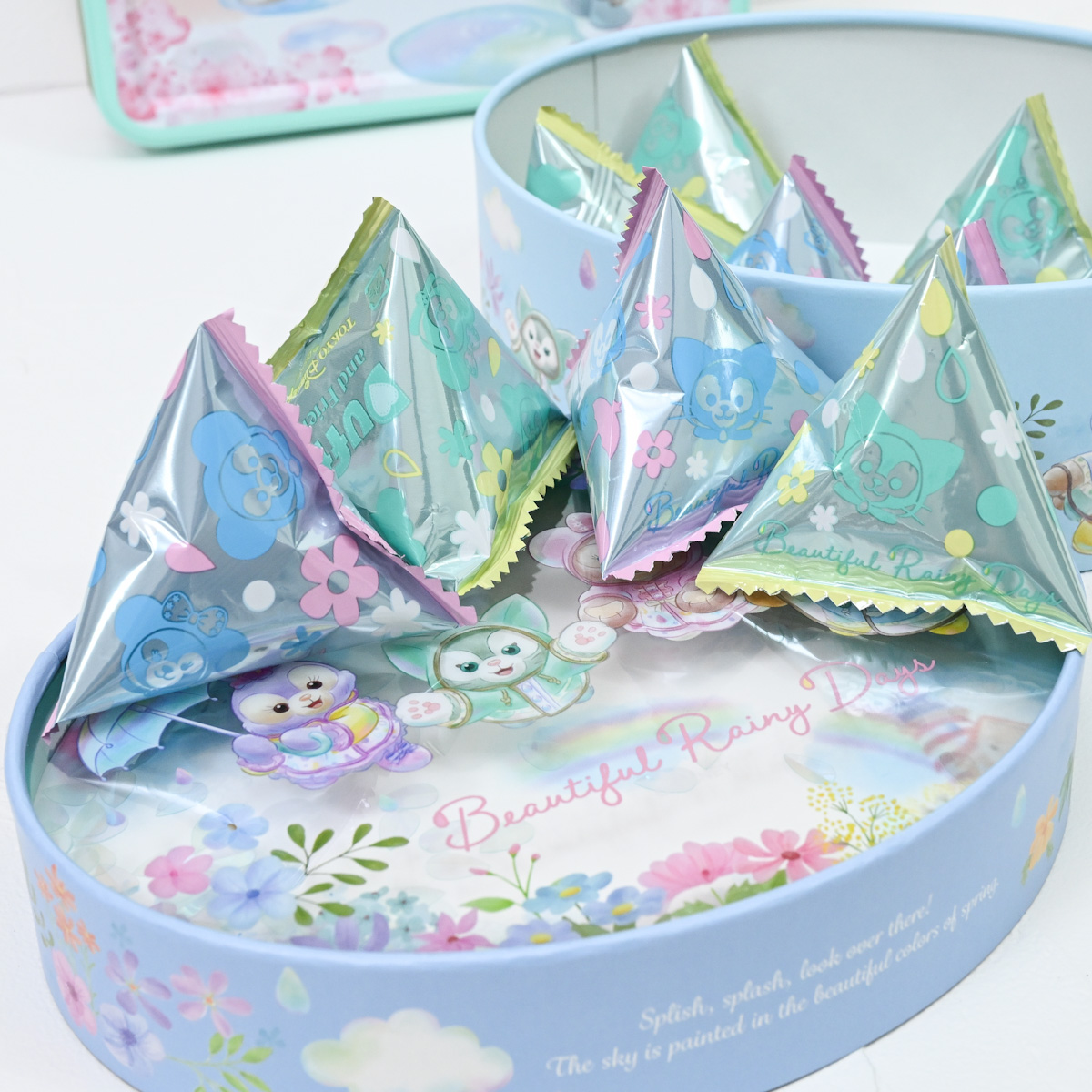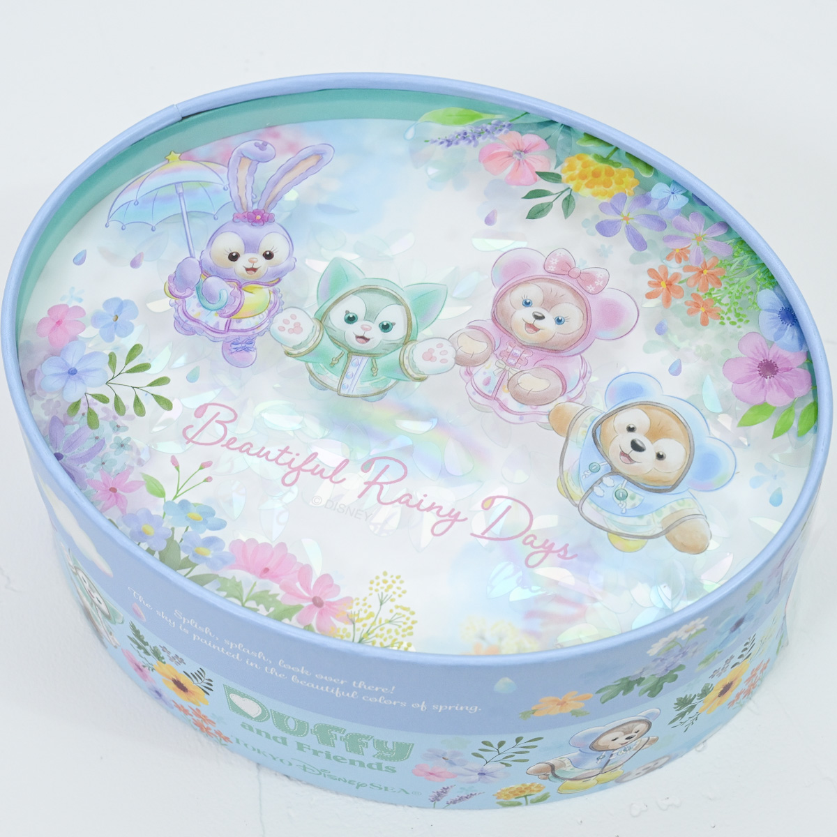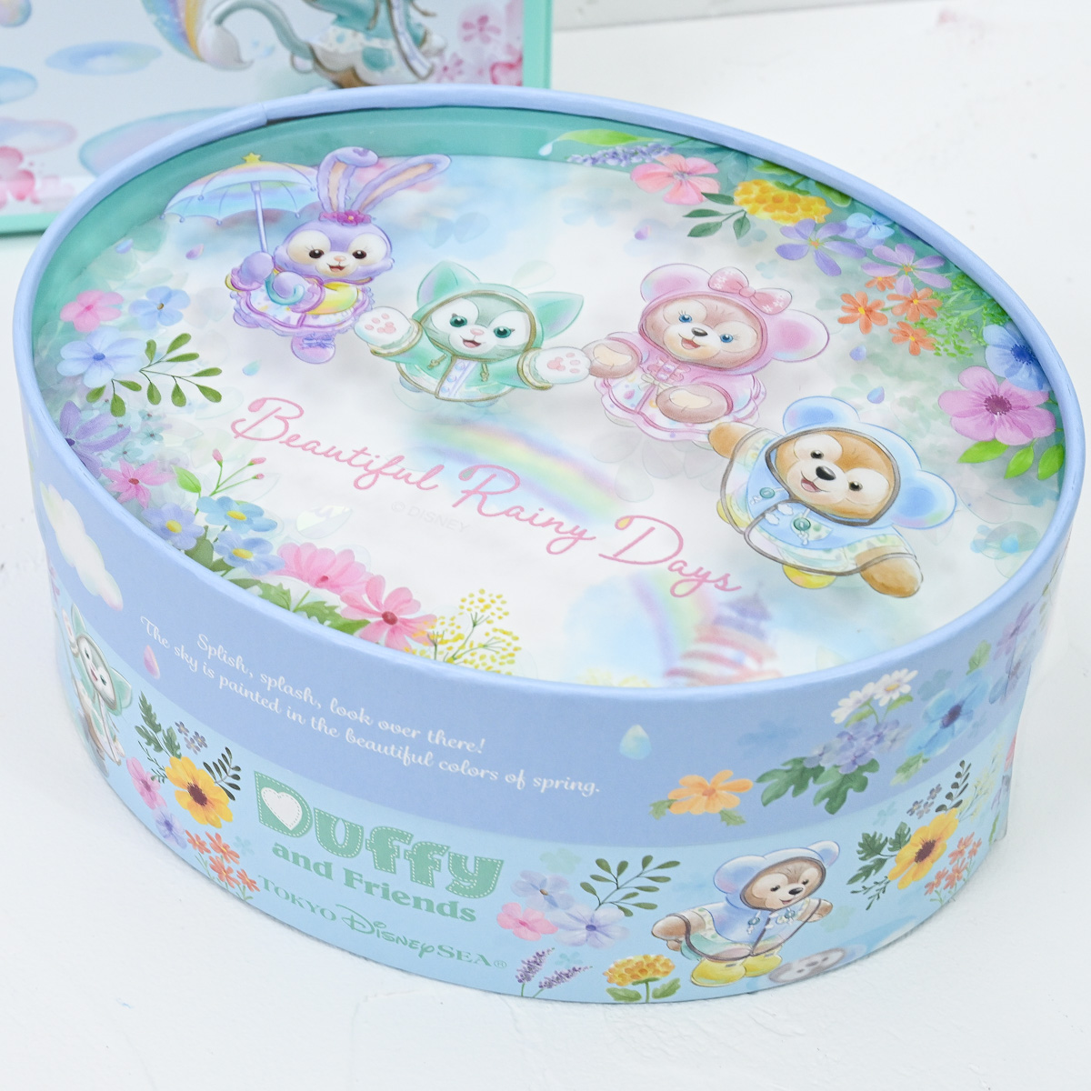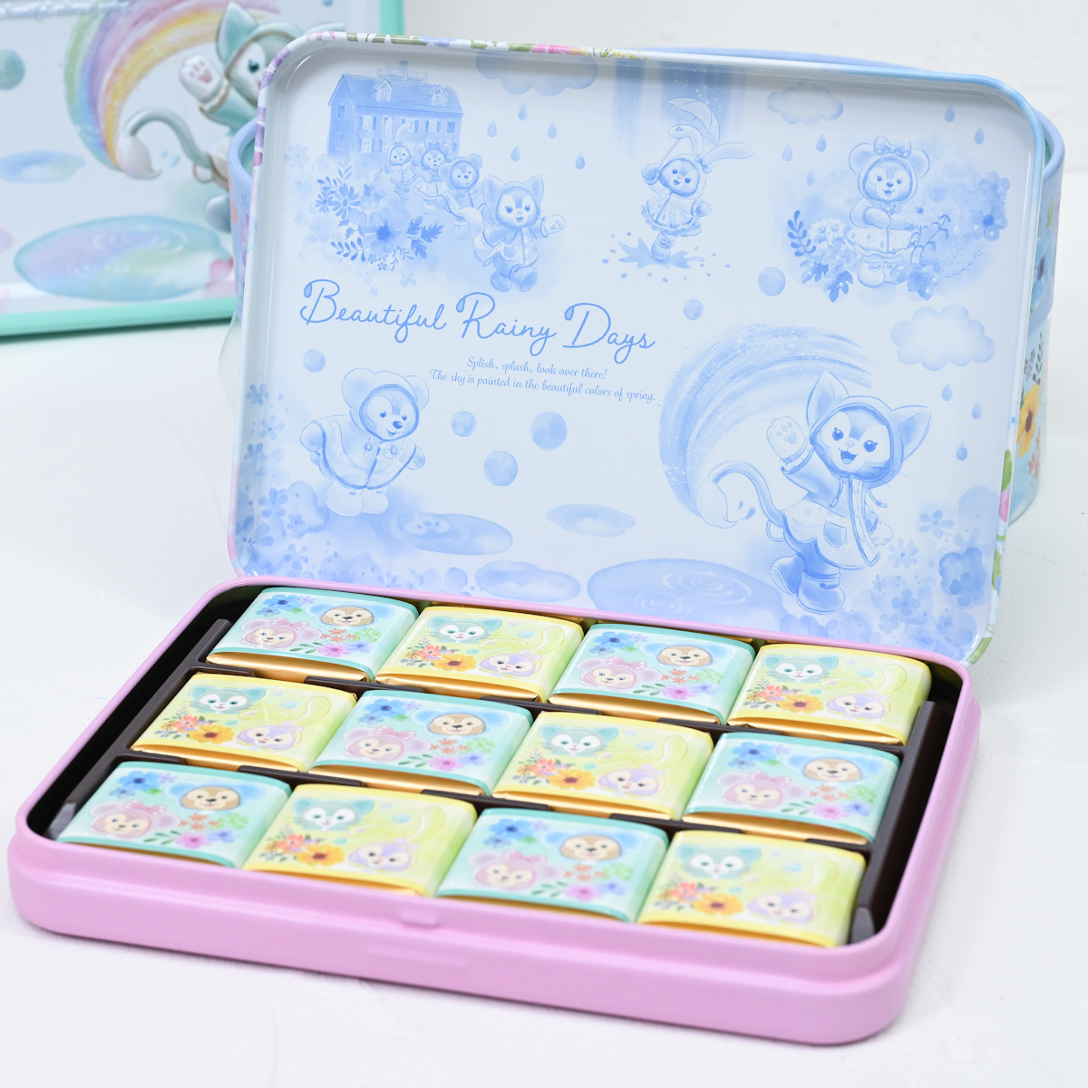 レインウェア姿のダッフィーたちがちょこっと立体的にデザインされた缶入りのお菓子詰め合わせ。