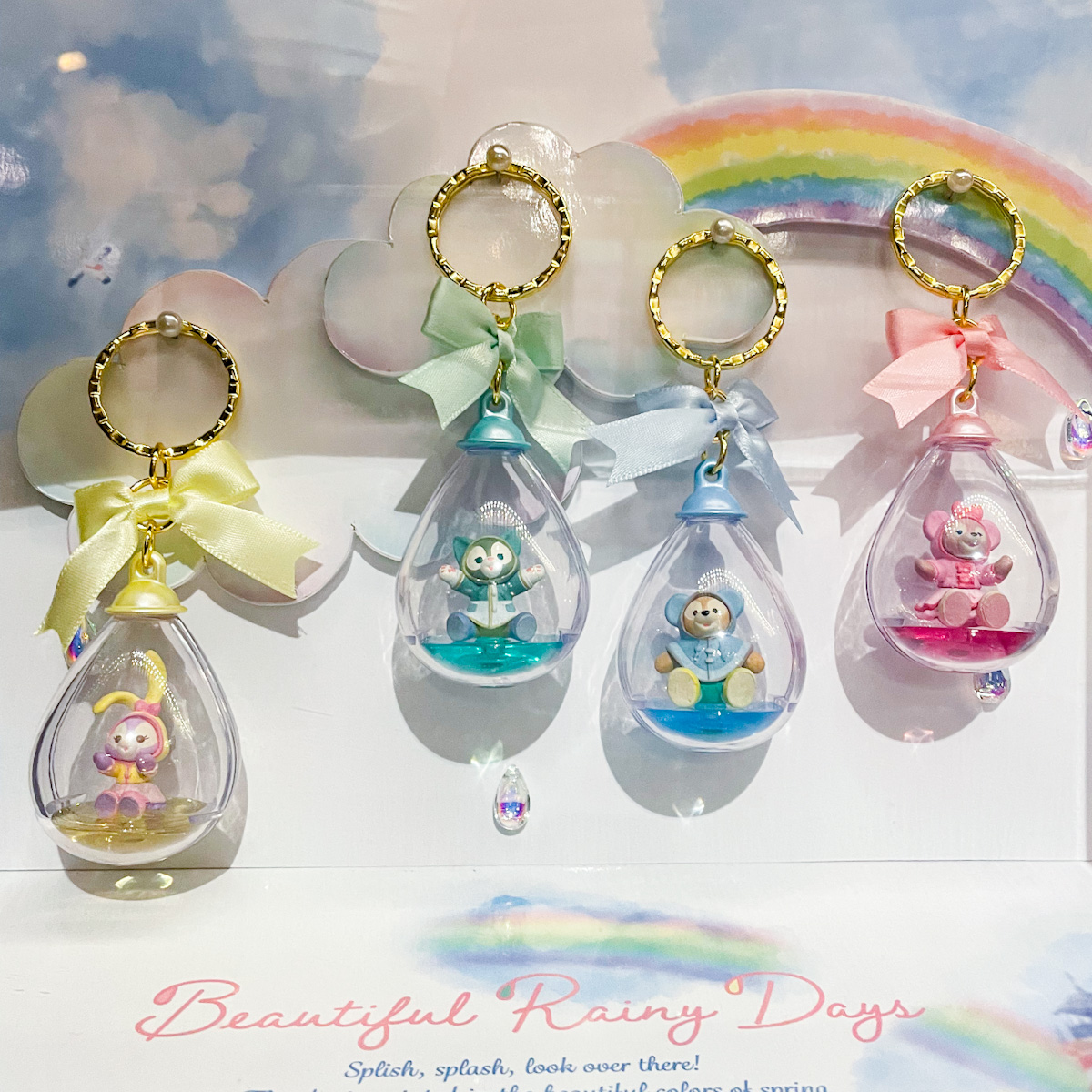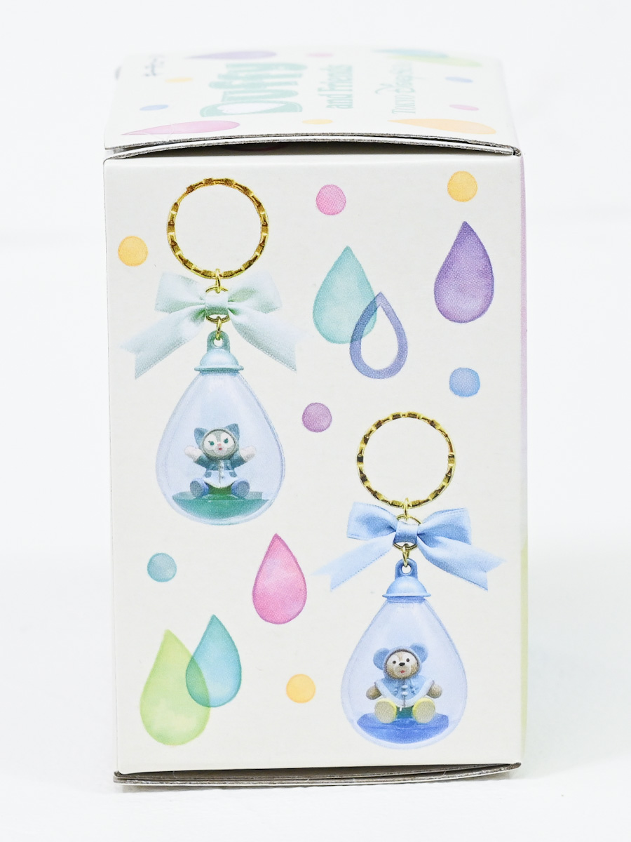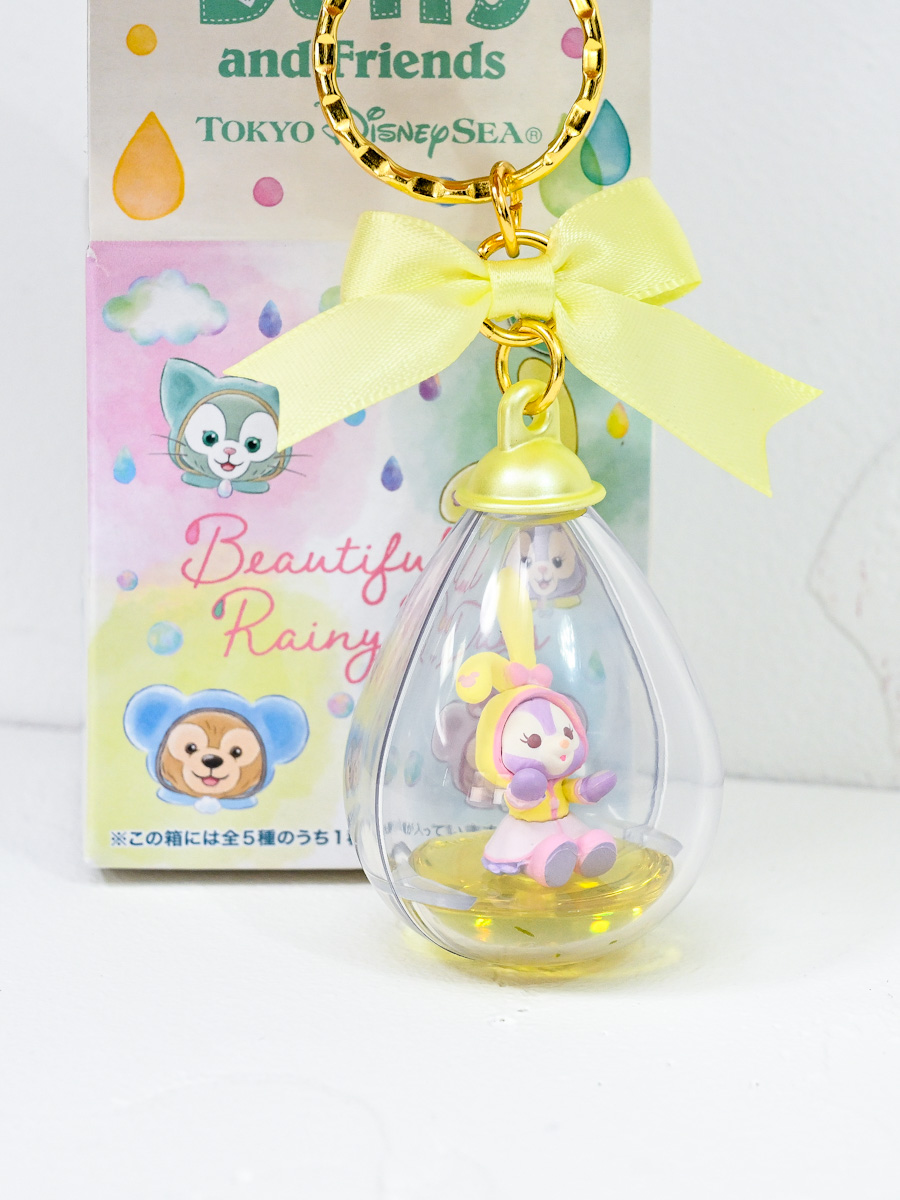 ダッフィーたちのフィギュアがしずく型に入っているデザインのキーチェーン。