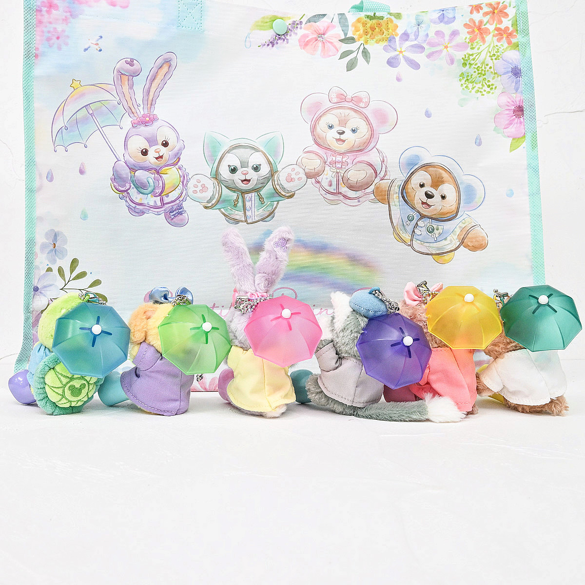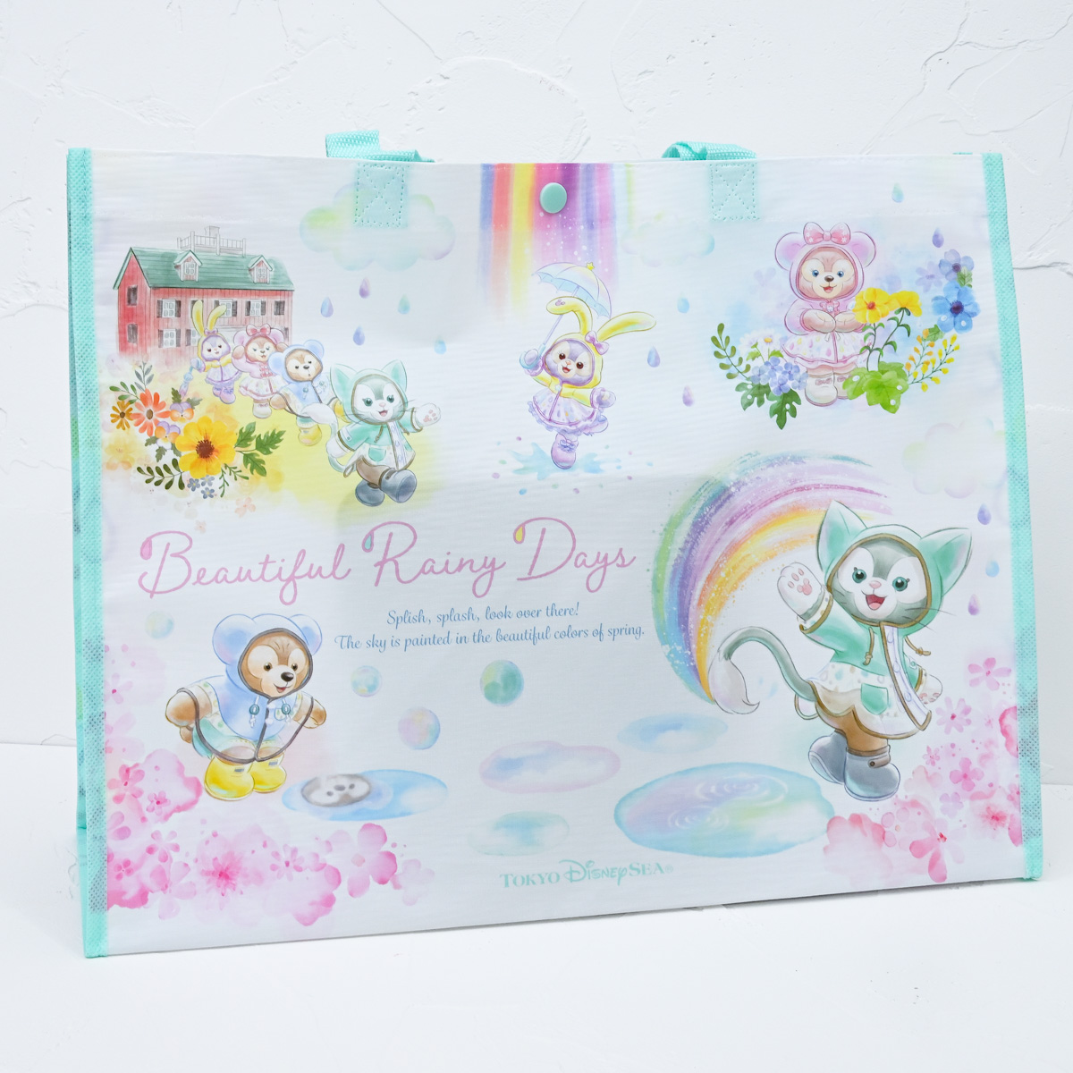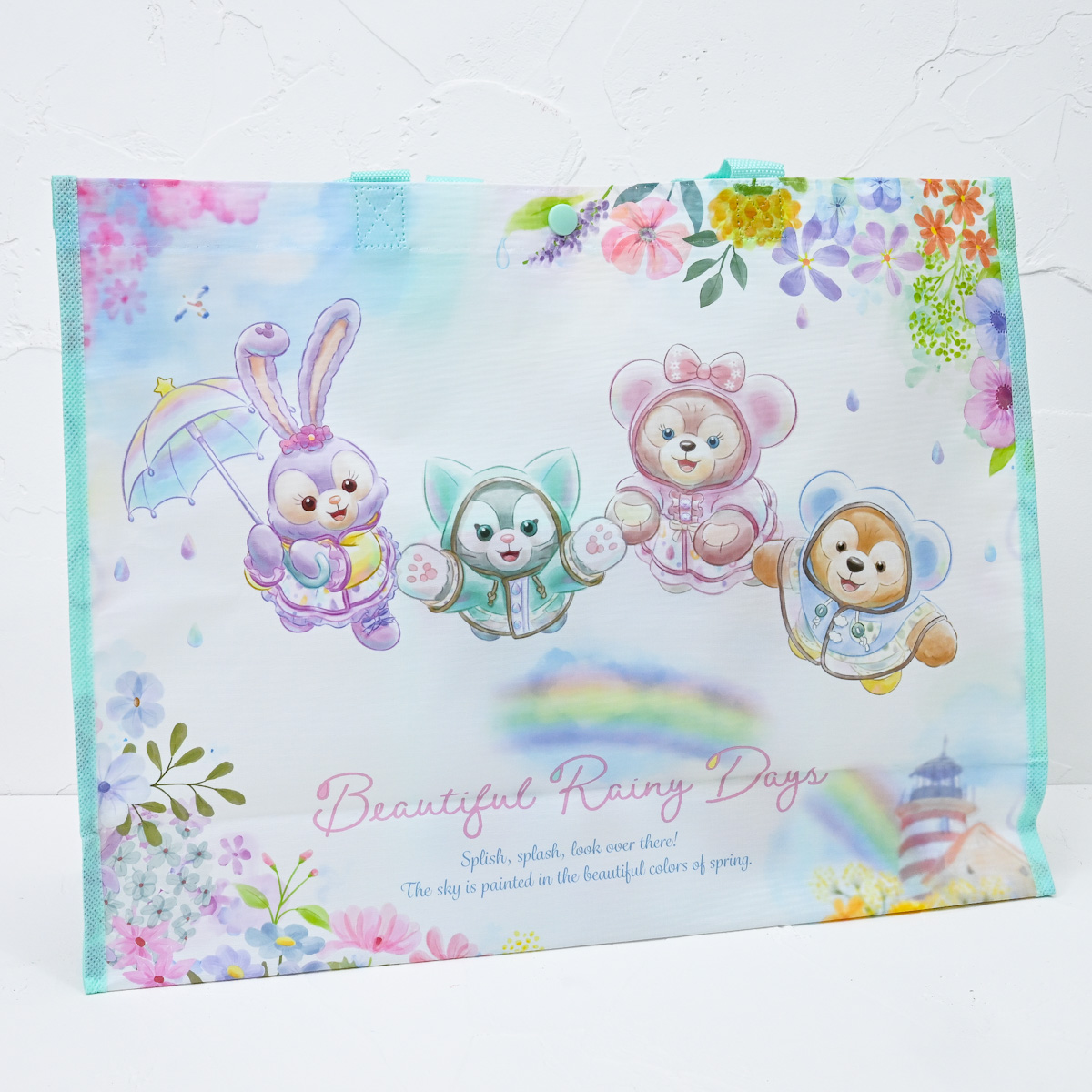 “ダッフィー&フレンズのビューティフル・レイニーデイズ”のメインアートとしずく柄がかわいいショッピングバッグ。