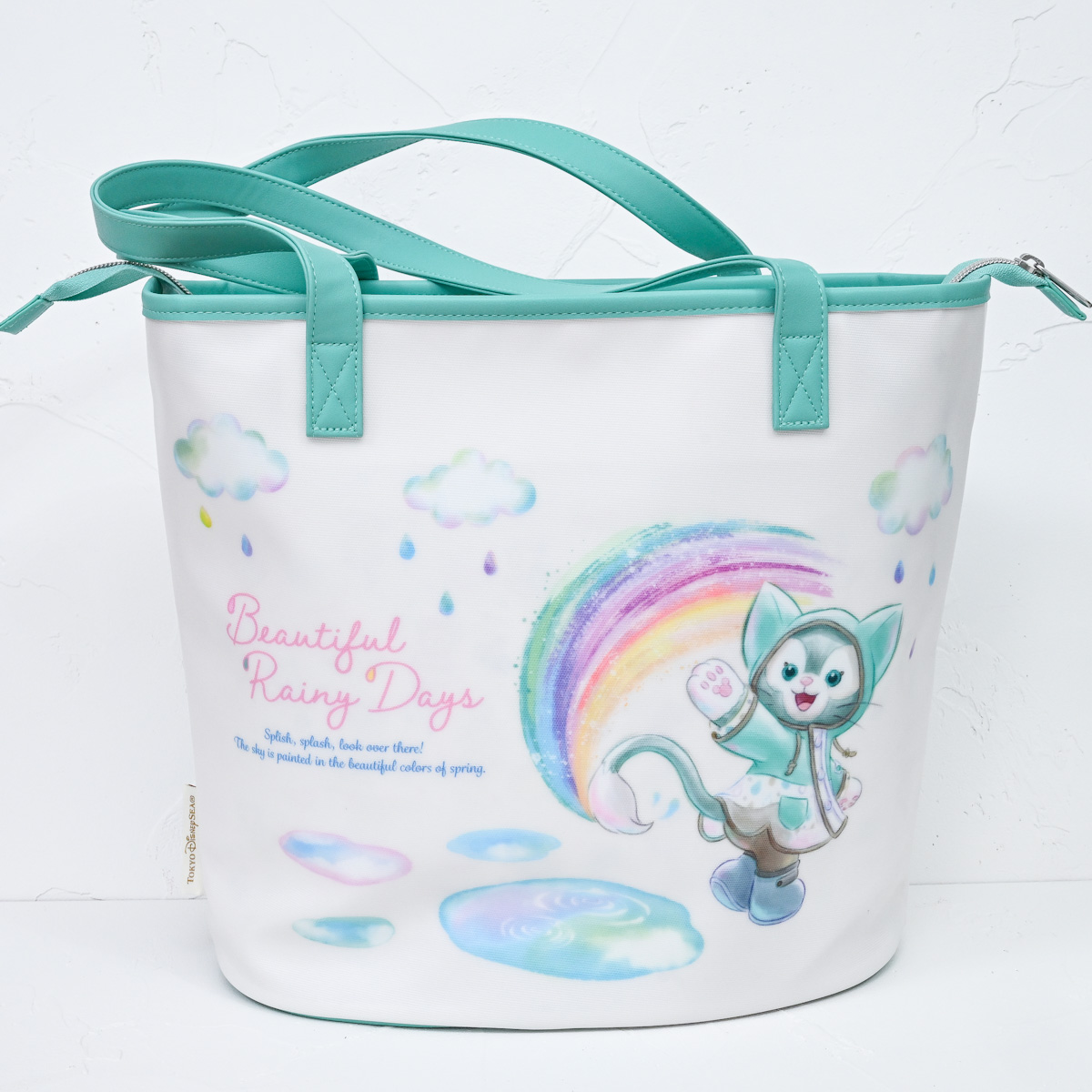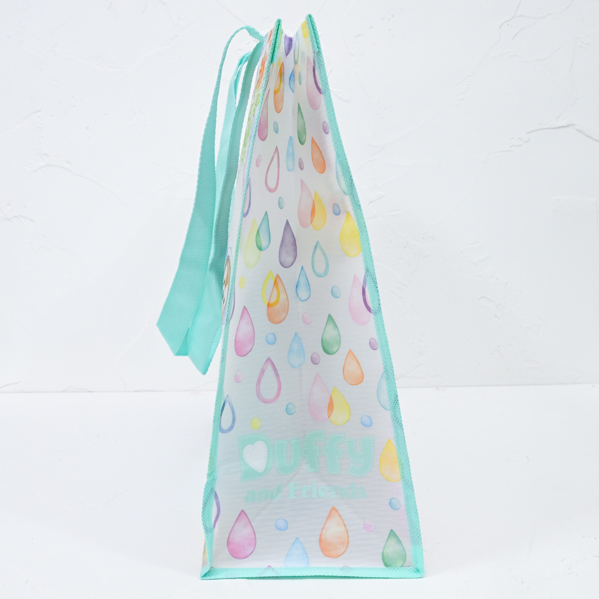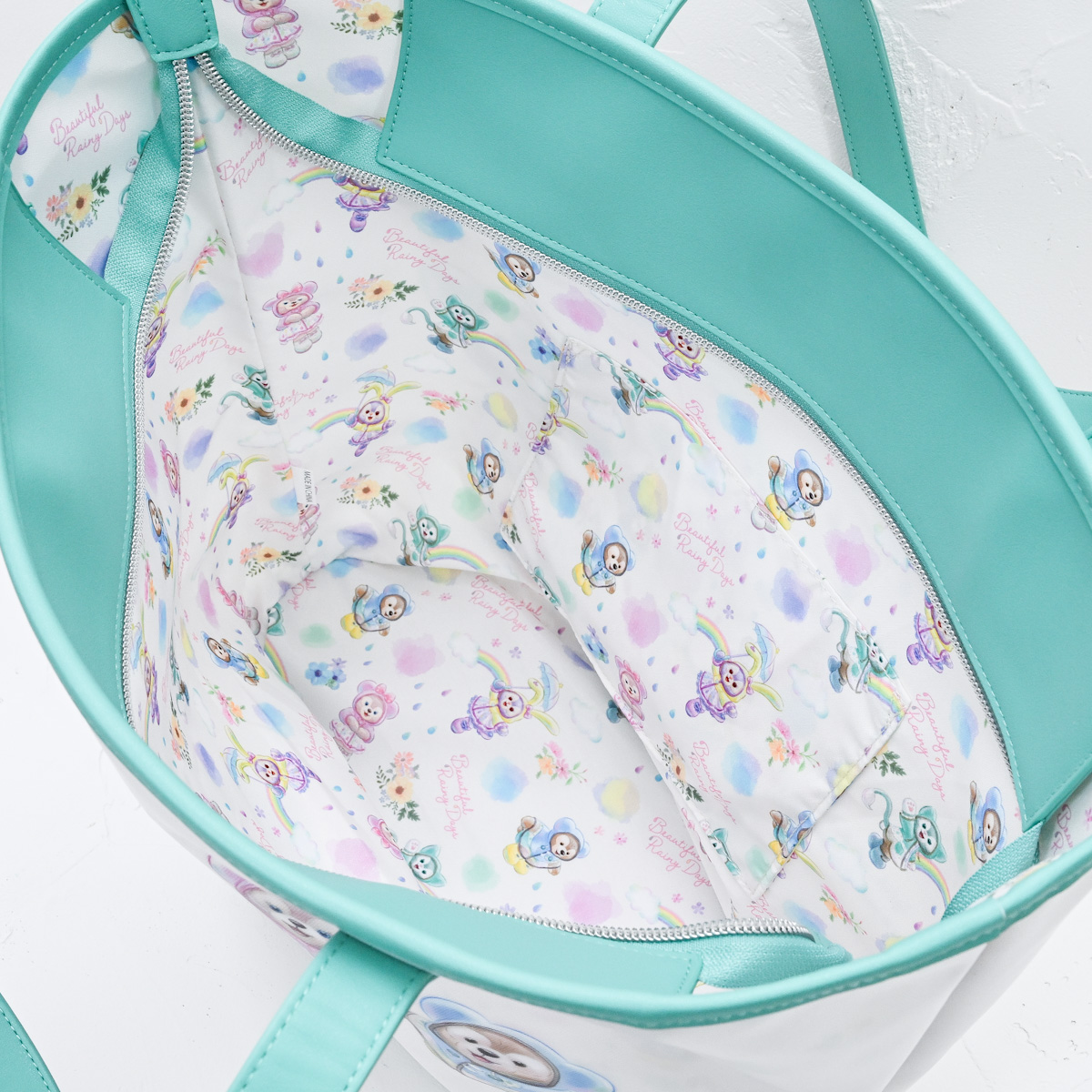 “ダッフィー&フレンズのビューティフル・レイニーデイズ”のメインアートとしずく柄がかわいいショッピングバッグ。
