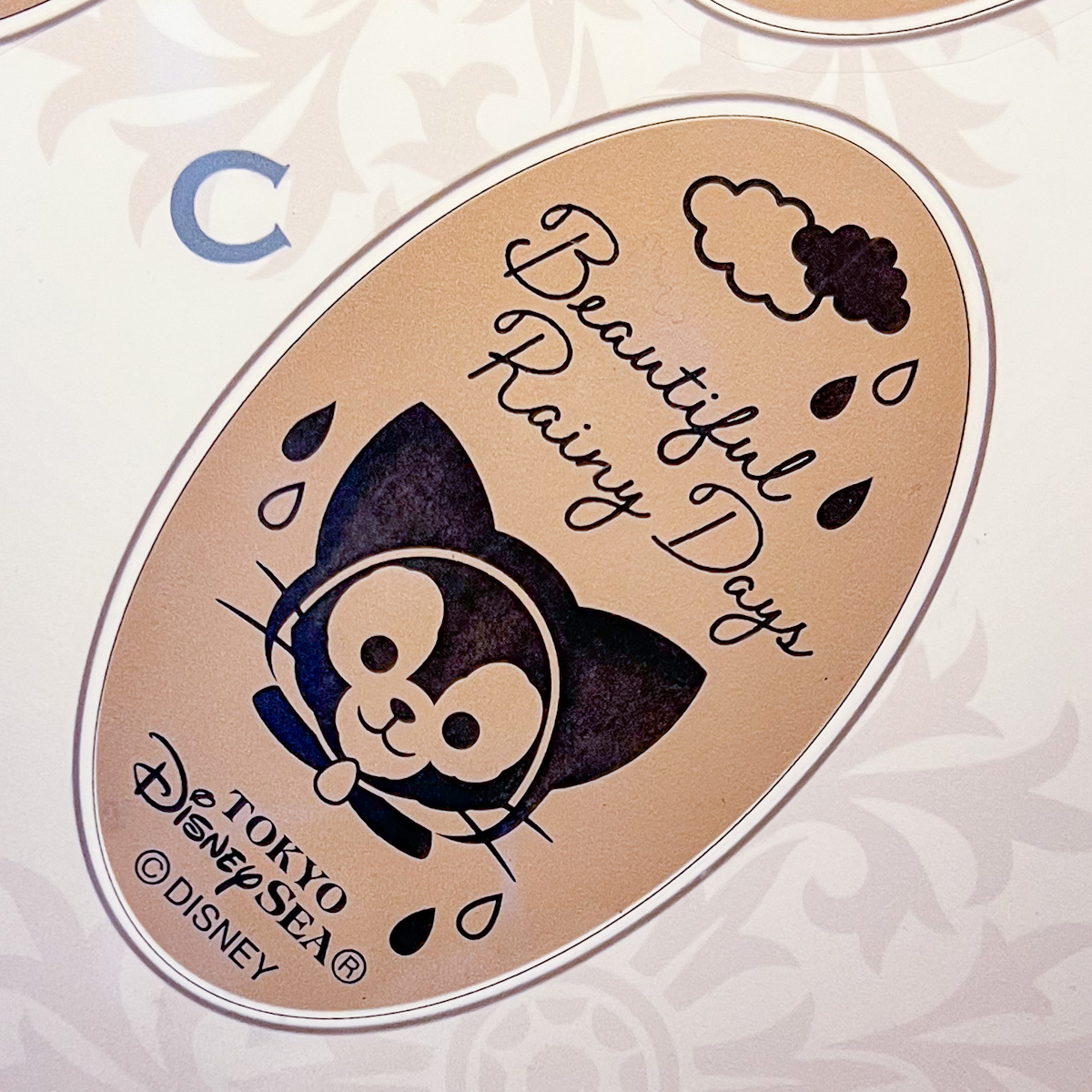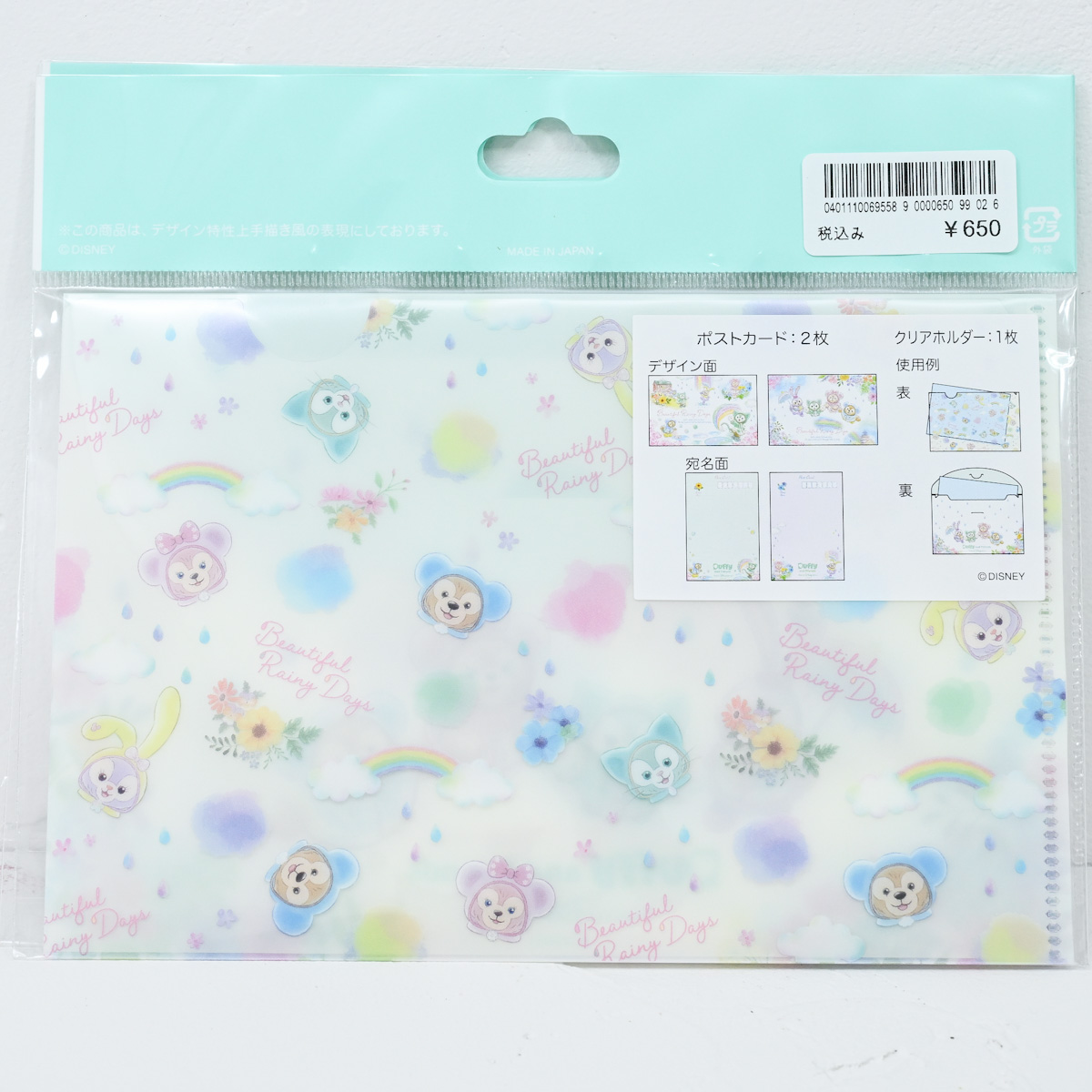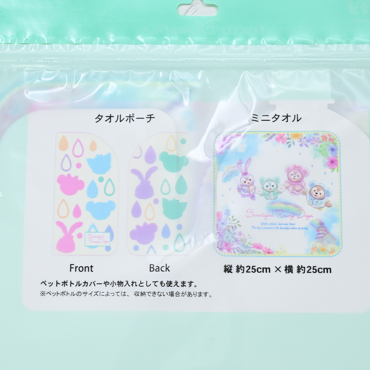 バックデザインはレインコート姿のダッフィーたちのお顔アップです。