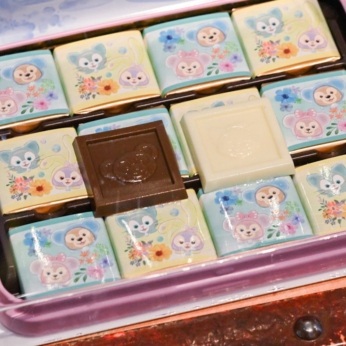 虹のかかった空を見上げるダッフィーたちがデザインされた缶入りのチョコレート。