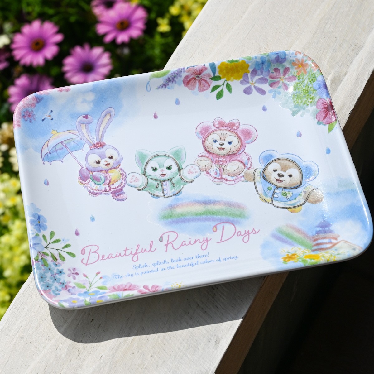 「ジェラトーニ」「ダッフィー」「シェリーメイ」「ステラ・ルー」の4人が、春の日の雨を楽しんでいるデザインのスペシャルグッズやスーベニア付きメニューが登場しています。