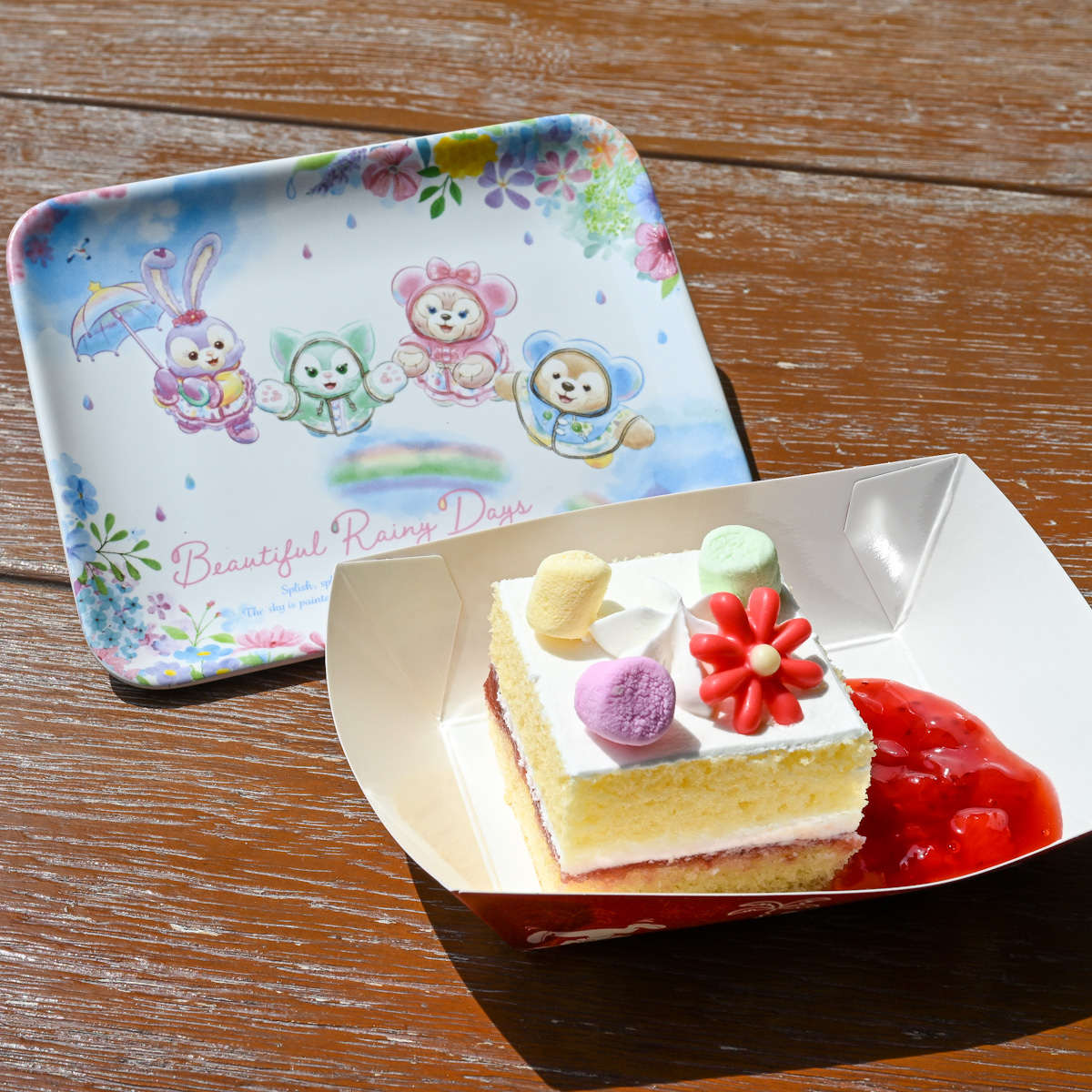 今回は、そんな“ダッフィー&フレンズのビューティフル・レイニーデイズ”デザインのスーベニアプレート付きショートケーキを紹介します☆