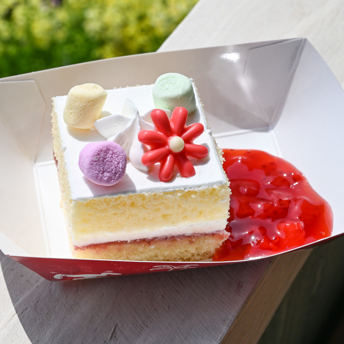 お花の形をしたチョコレートと、ピンク・緑・黄色のマシュマロがトッピングされたまるで花畑のようなショートケーキ。