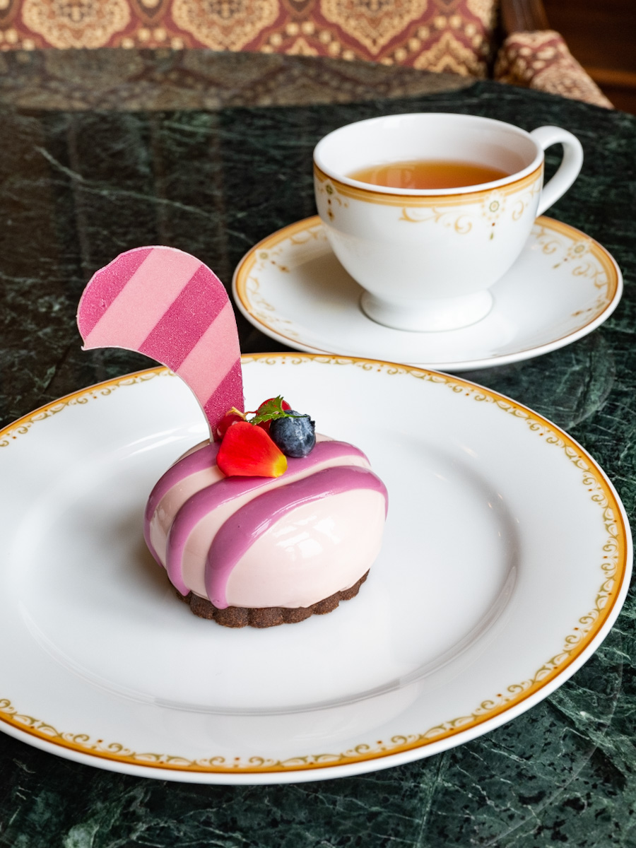 今回は、そんなドリーマーズ・ラウンジで2022年3月31日より提供がスタートしたディズニー映画『ふしぎの国のアリス』の人気キャラクター「チェシャ猫」風のかわいいケーキセットを紹介します。