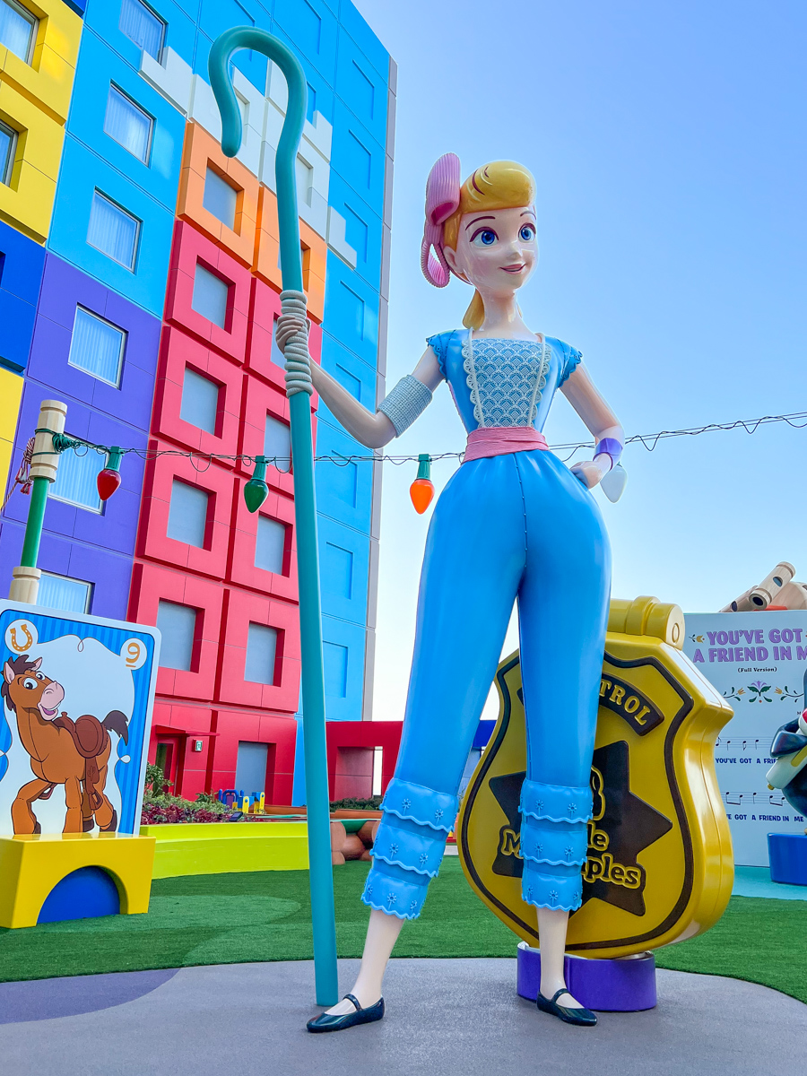 ロビーを抜けた先にある中庭「トイフレンズ・スクエア」ではパンツスタイルのボー・ピープたちのキャラクター像がゲストを待っています☆