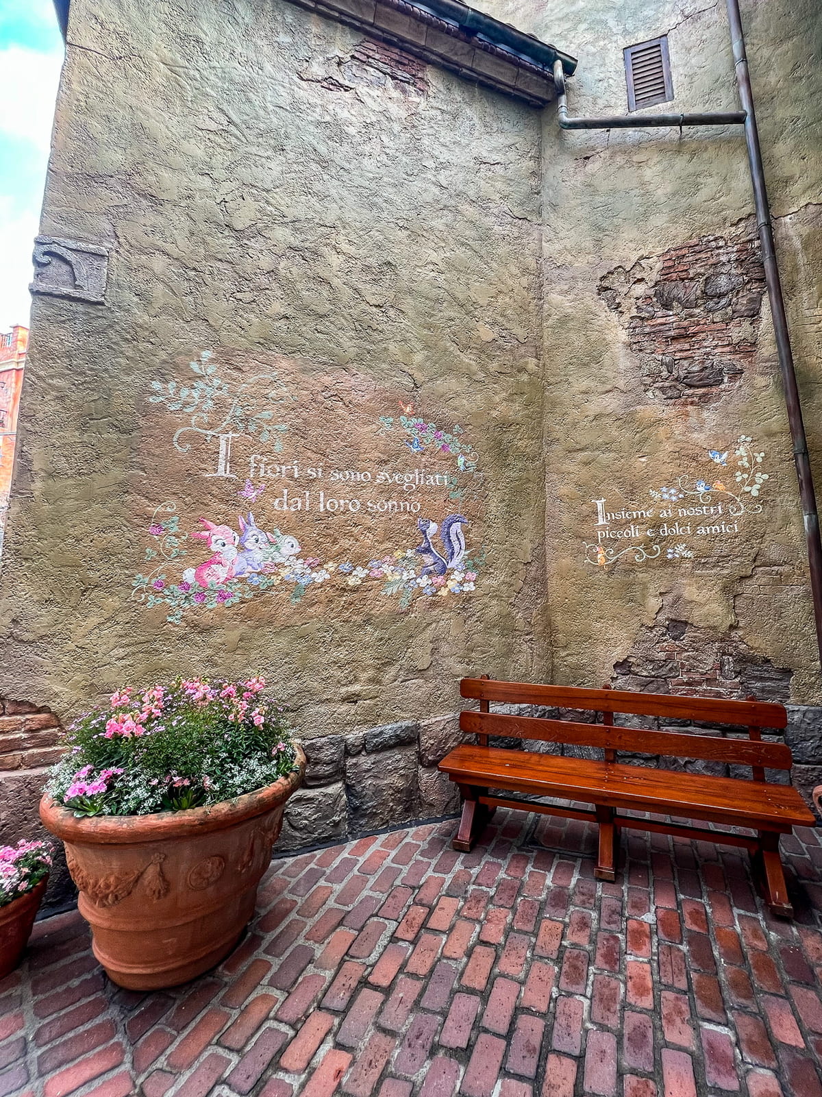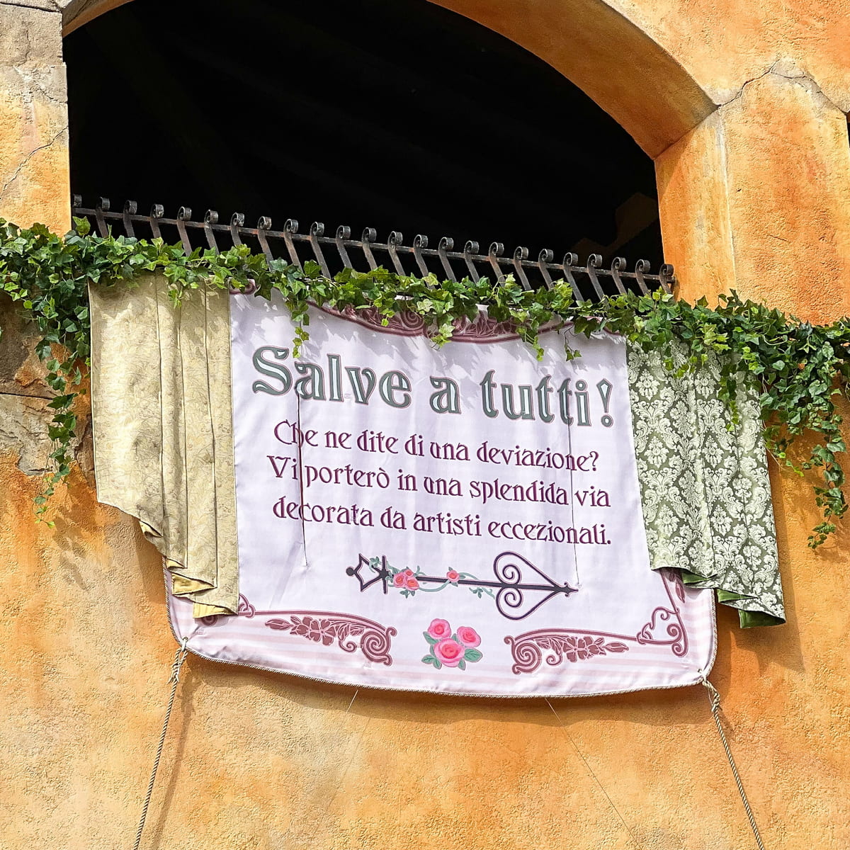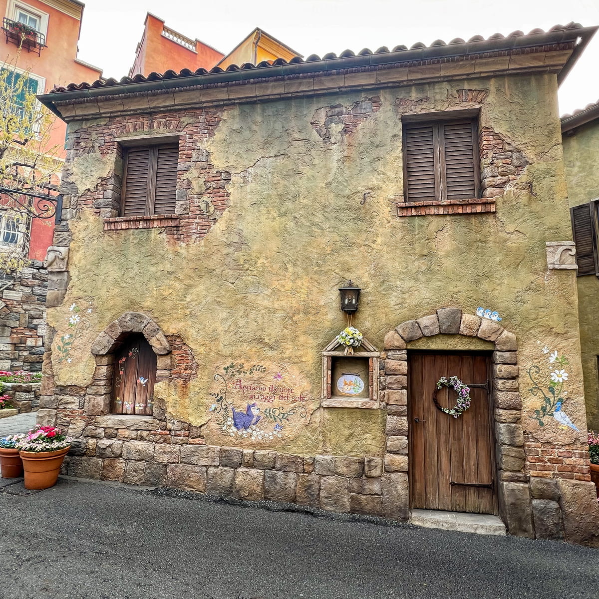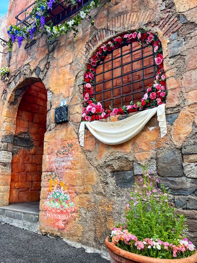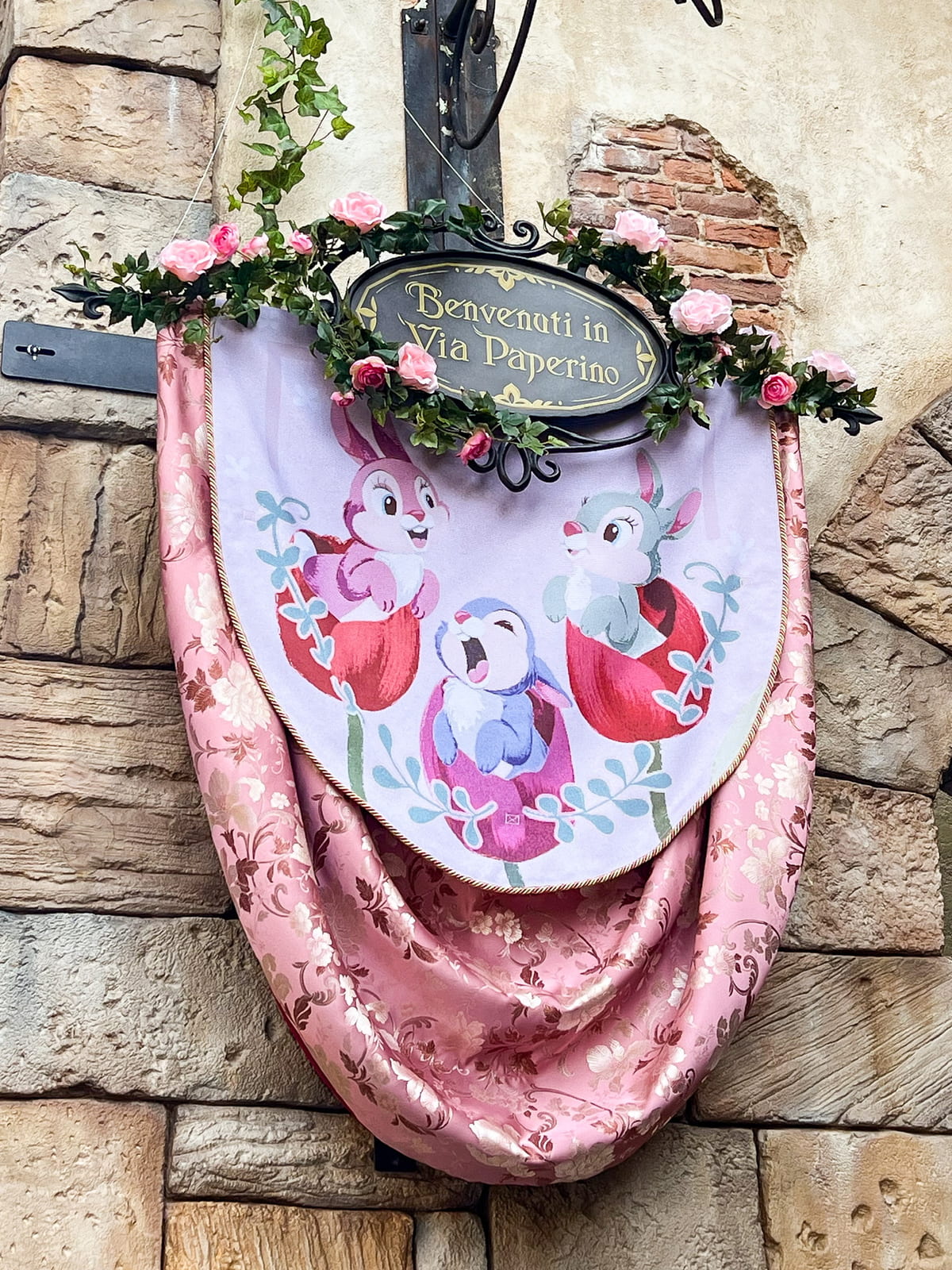 レストラン「ザンビーニ・ブラザーズ・リストランテ」とショップ「イル・ポスティーノ・ステーショナリー」の間にあるヴィア・パペリーノ(パペリーノ通り)では春をお祝いする様子をイメージしたデコレーションが登場しています。