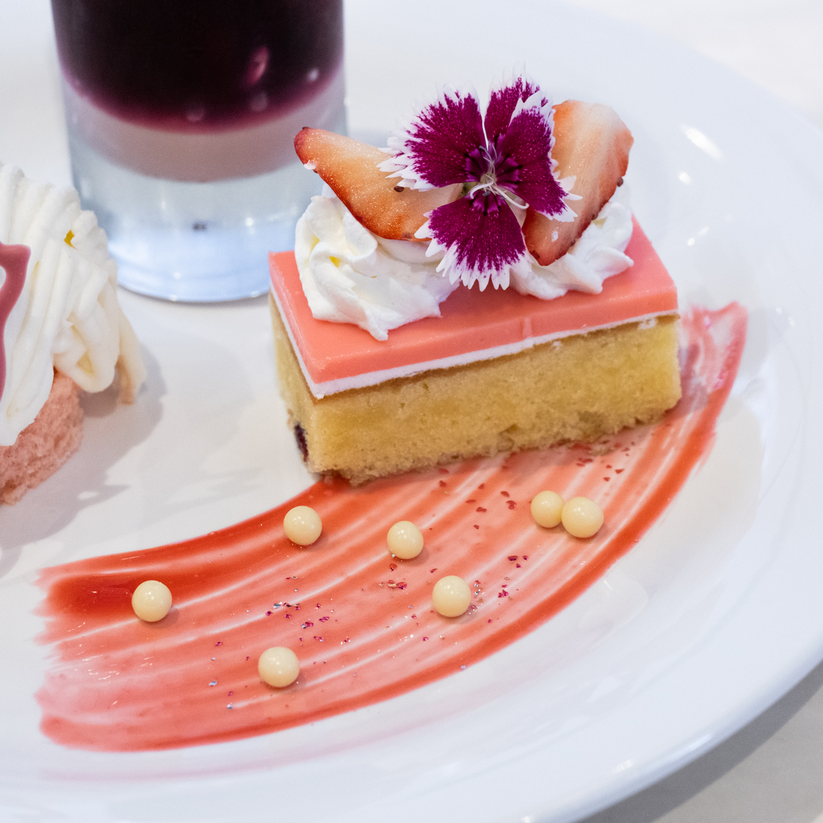 デザートプレートには、チーズクリームのモンブラン、クランベリーケーキ、ラズベリーゼリーが盛り付けられています。