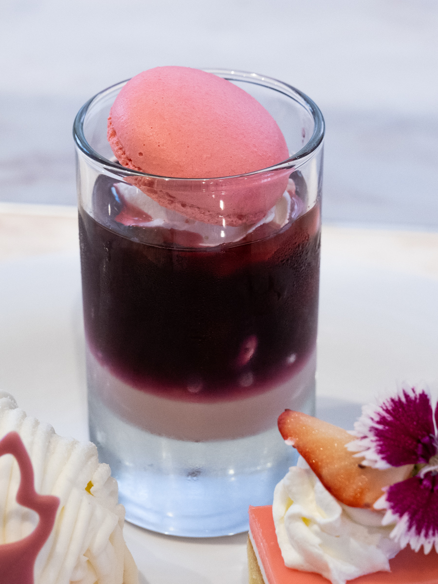 ラズベリーゼリーにピンク色のマカロンがトッピングされたグラスデザートです。