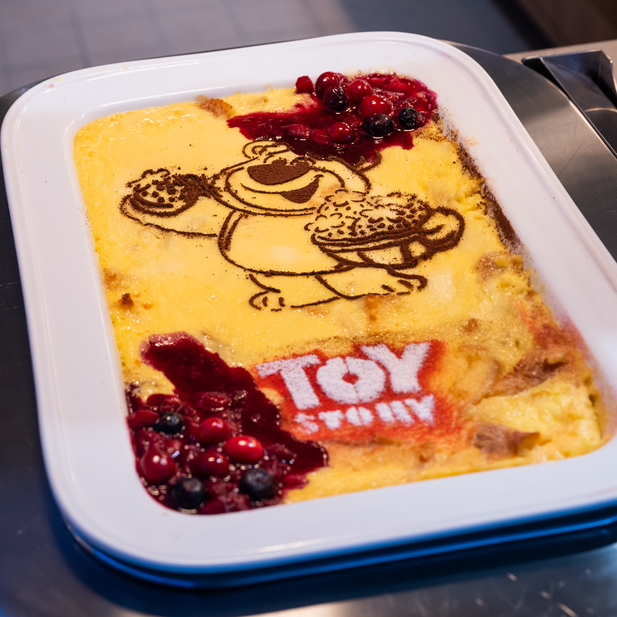 イチゴを抱えた「ロッツォ・ハグベア」、『トイ・ストーリー』のロゴがデザインされたミックスベリーのパングラタン。