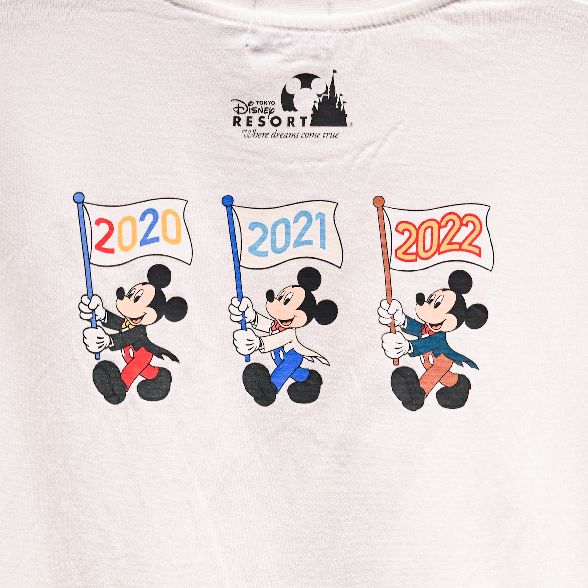 背中側にも2020、2021、2022の旗を持った燕尾服姿の「ミッキーマウス」がデザインされています。