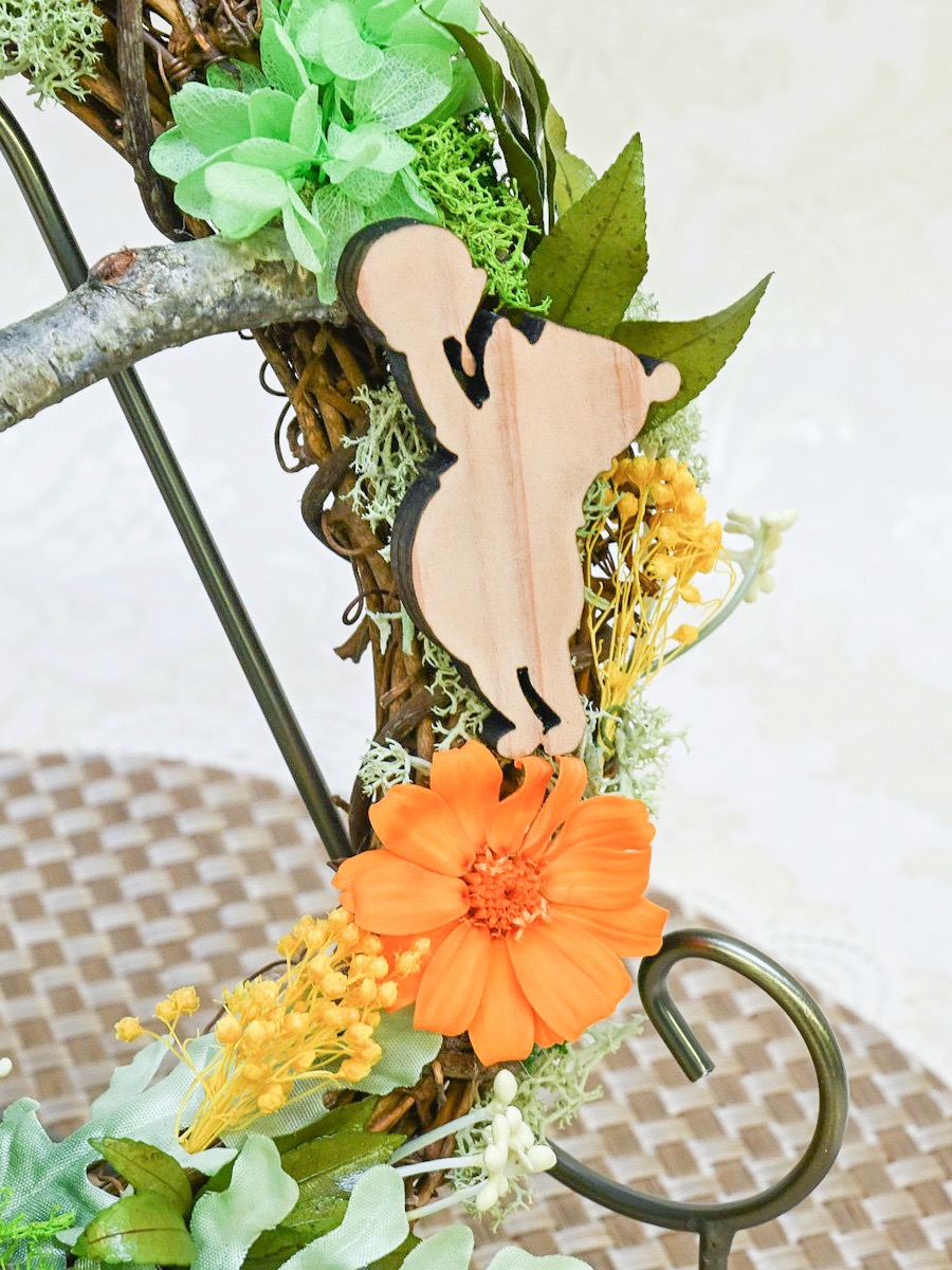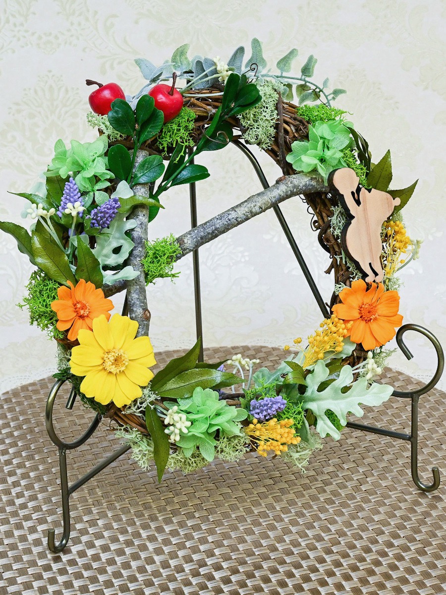 リース型のフラワーアレンジなので、写真のようにお手持ちのスタンドに飾るのはもちろん、壁に飾るのもおすすめです☆