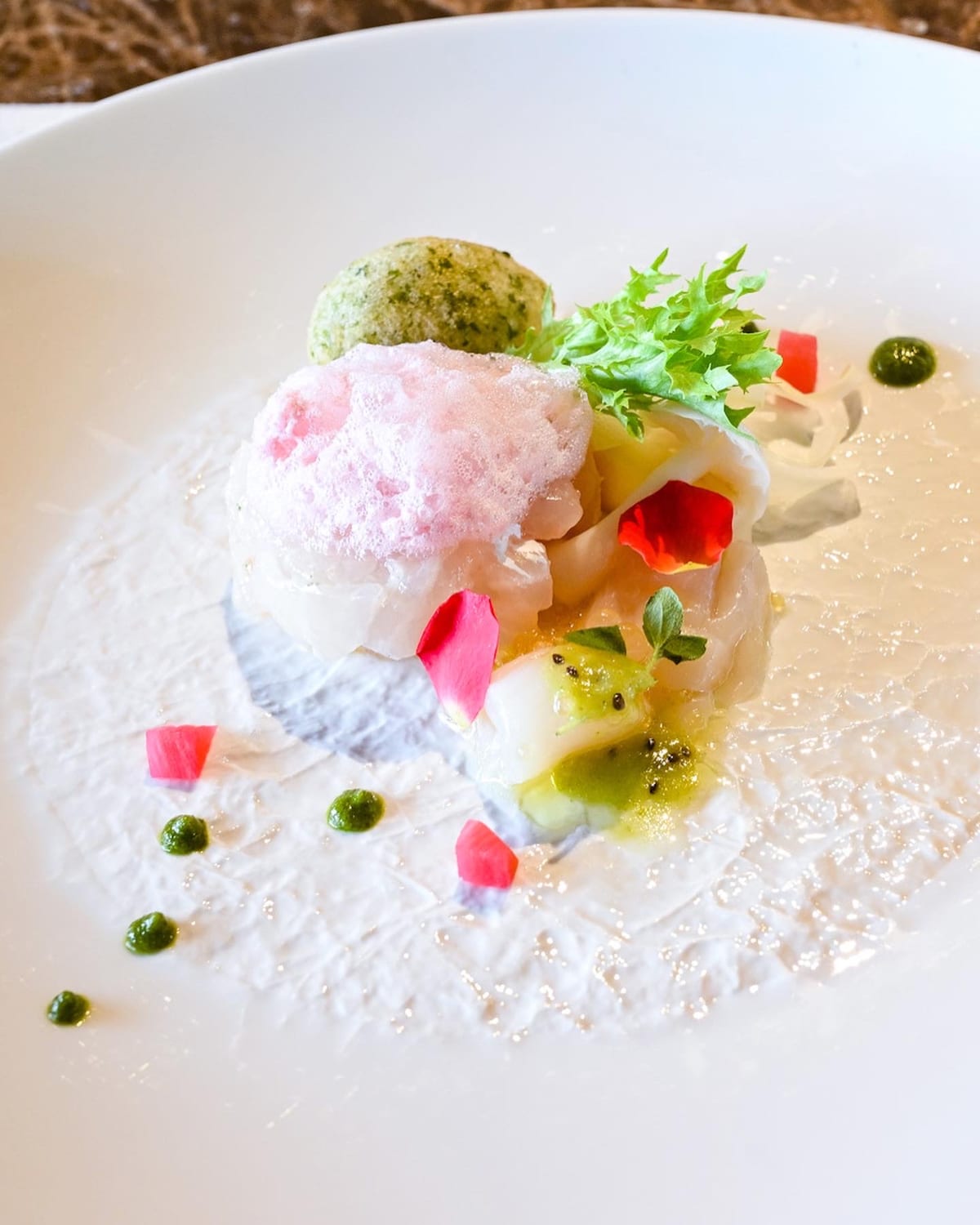 • 真鯛のティンバッロ仕立て グリーンオリーヴピュレ 帆立貝のマリネ ゼッポリーネ