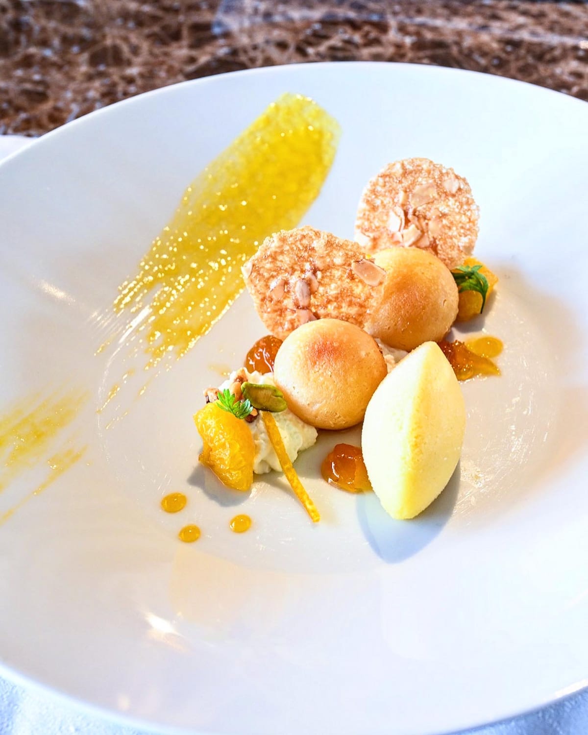 ナポリの名物焼き菓子の一種であるババとリコッタクリーム、爽やかなオレンジソルベが添えられています。