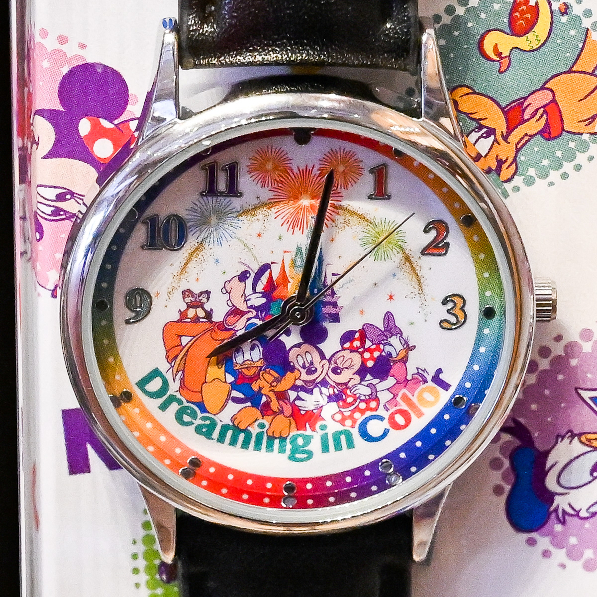 12時の文字がミッキーシェイプの花火デザインなのもかわいい腕時計。