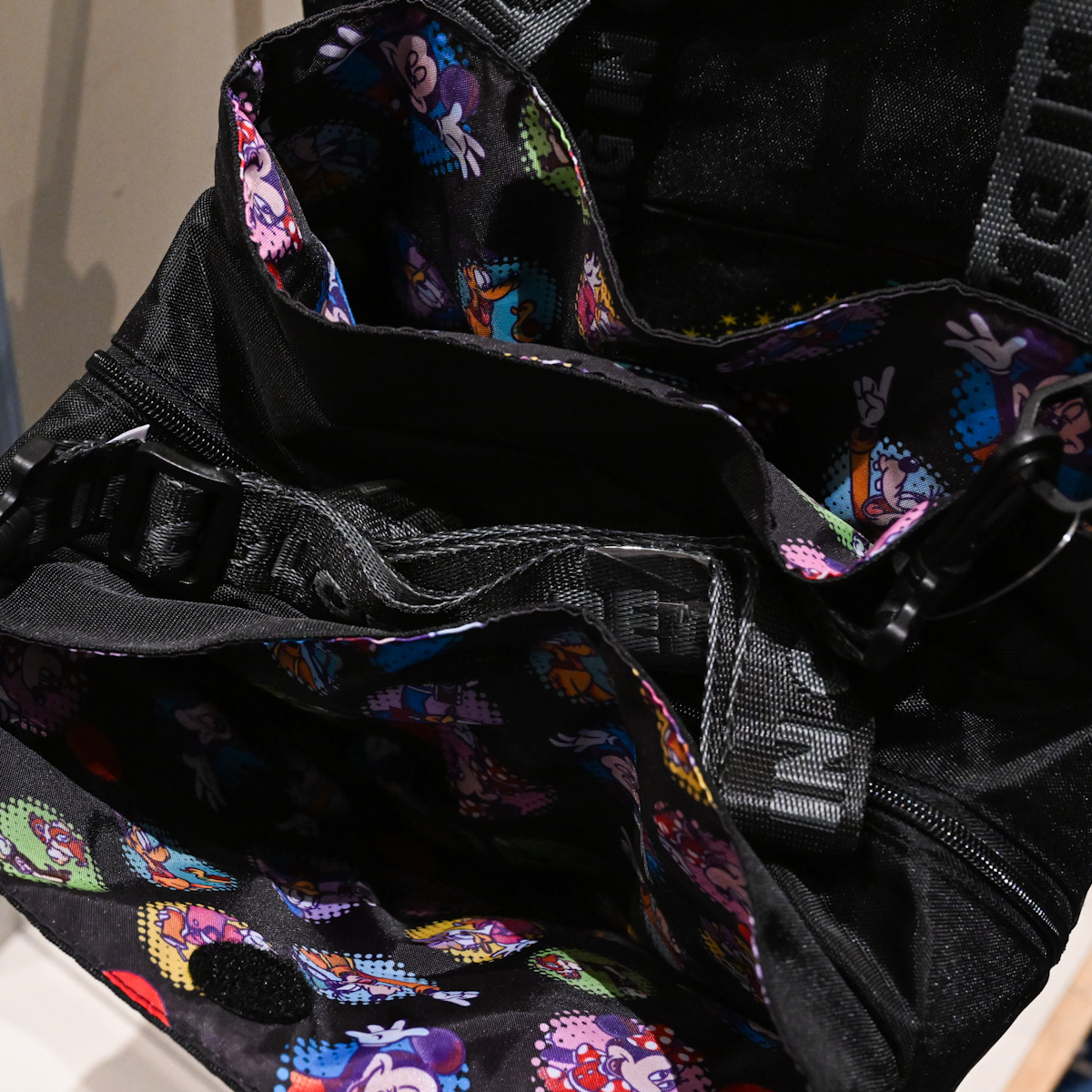同じく内側がカラフルな総柄になっているトートバッグ。
