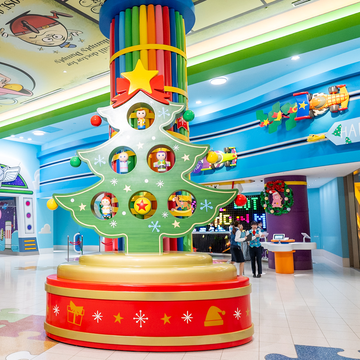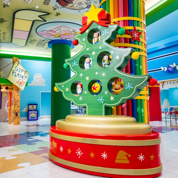 ホテルのロビーには『トイ・ストーリー』シリーズの人気キャラクターたちをモチーフにしたかわいいクリスマスツリーが登場!