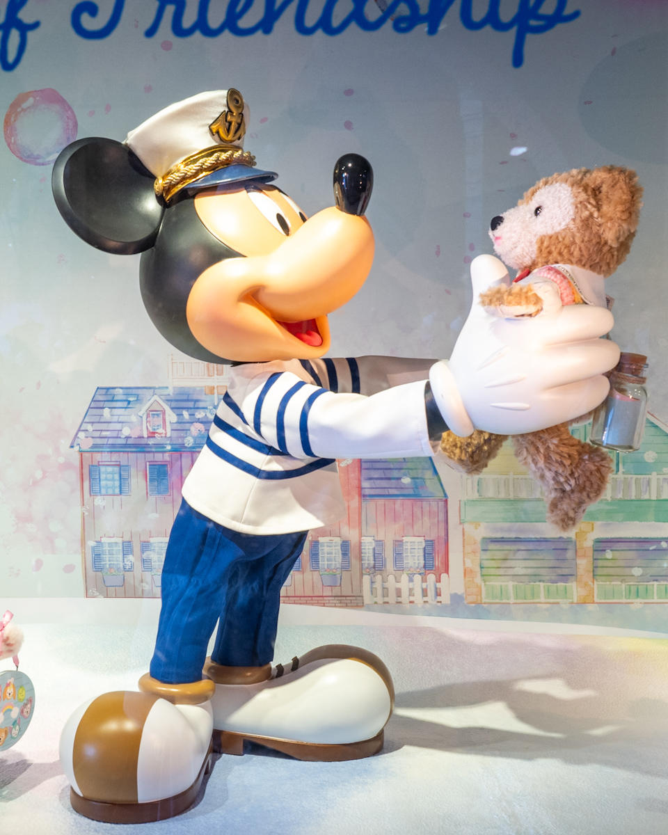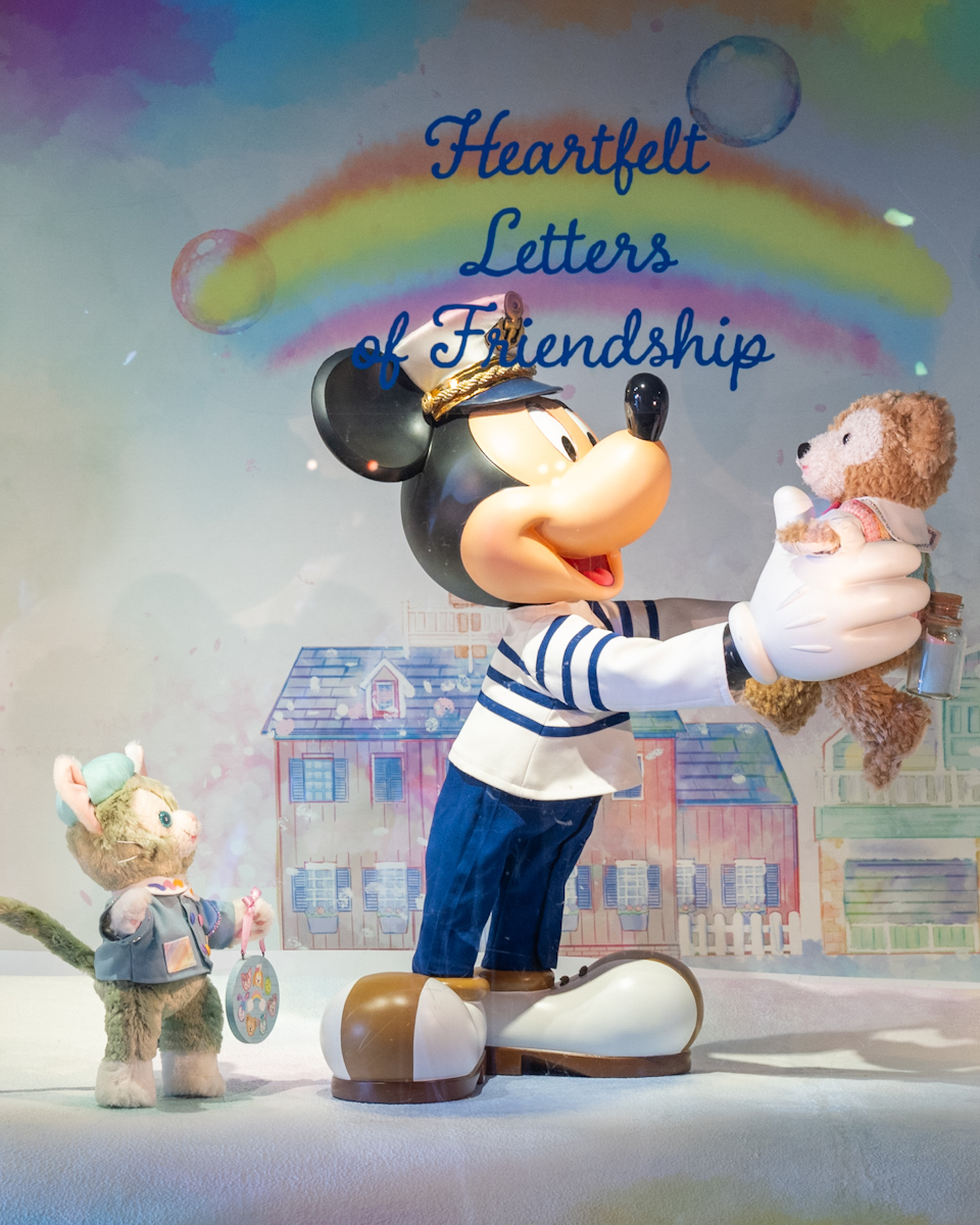 「エンポーリオ」のウィンドウには、20周年コスチュームのダッフィー、ジェラトーニ、オル・メル、