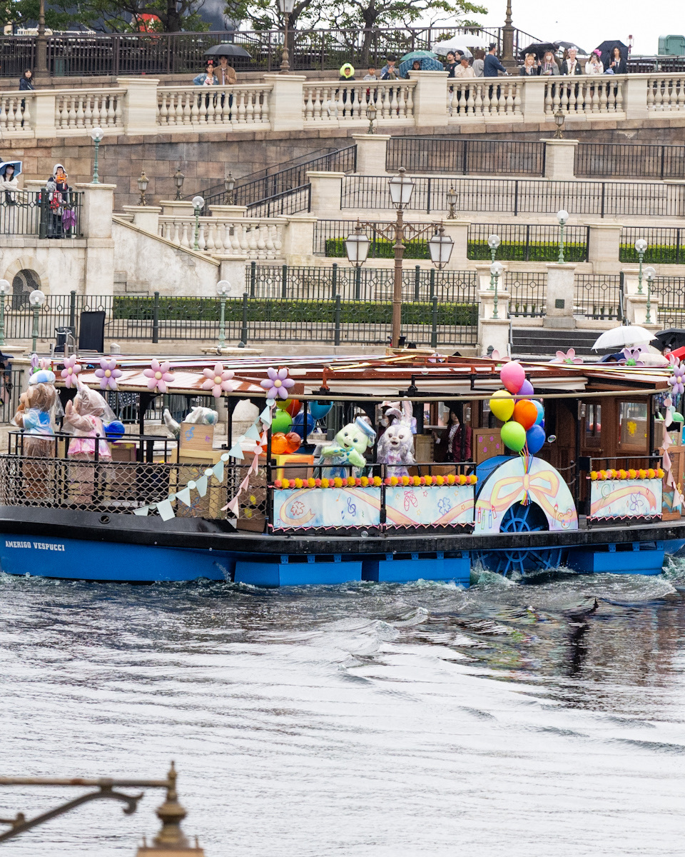 20周年をお祝いするコスチュームを着たダッフィー&フレンズが自分たちで飾り付けをした船に乗って、小さな冒険に出発☆