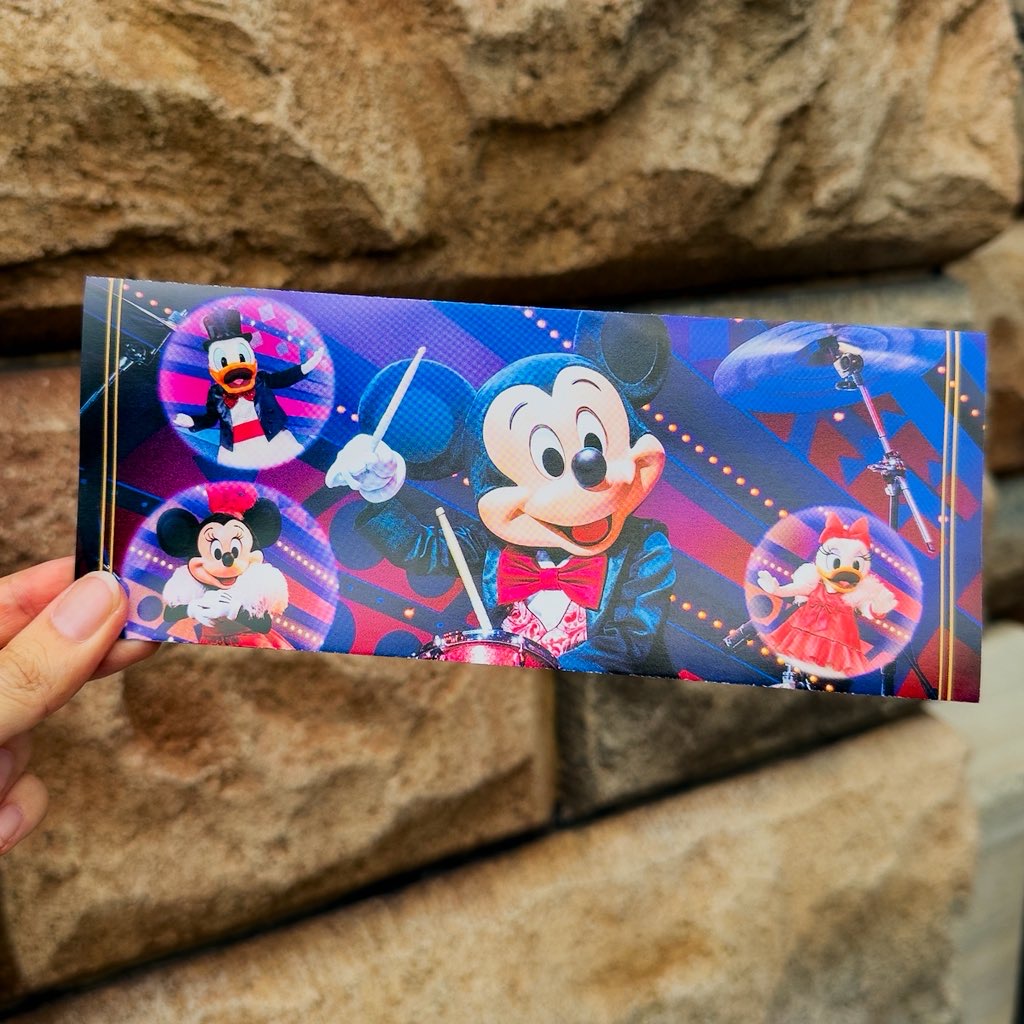 ドラムをたたくミッキーがデザインされた大きなクリアホルダーと、ショーのチケットをモチーフのチケットケースのセット。