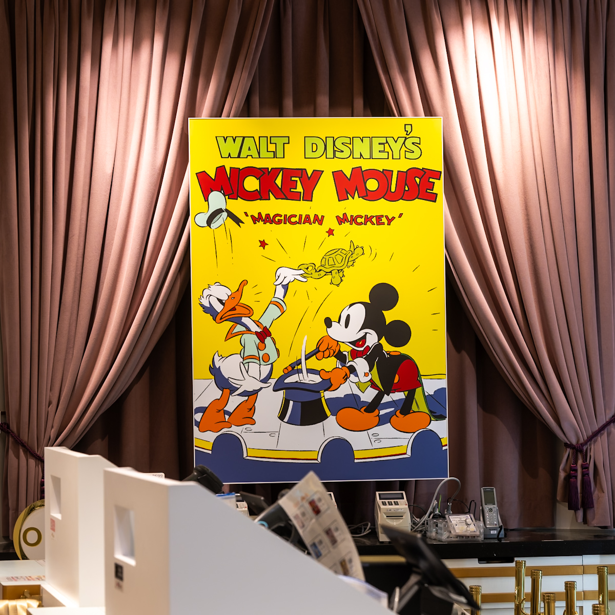 店舗のカラーリングにも合うピンクとグリーンのネクタイにはミッキーのシルエット。
