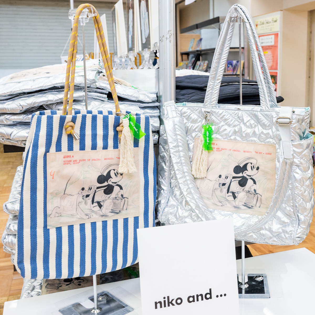 ミッキーマウス、にほんばしがデザインされたトートバッグ。