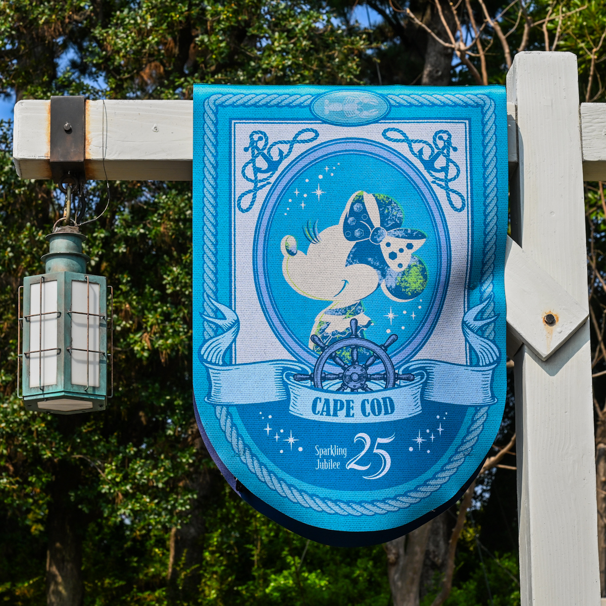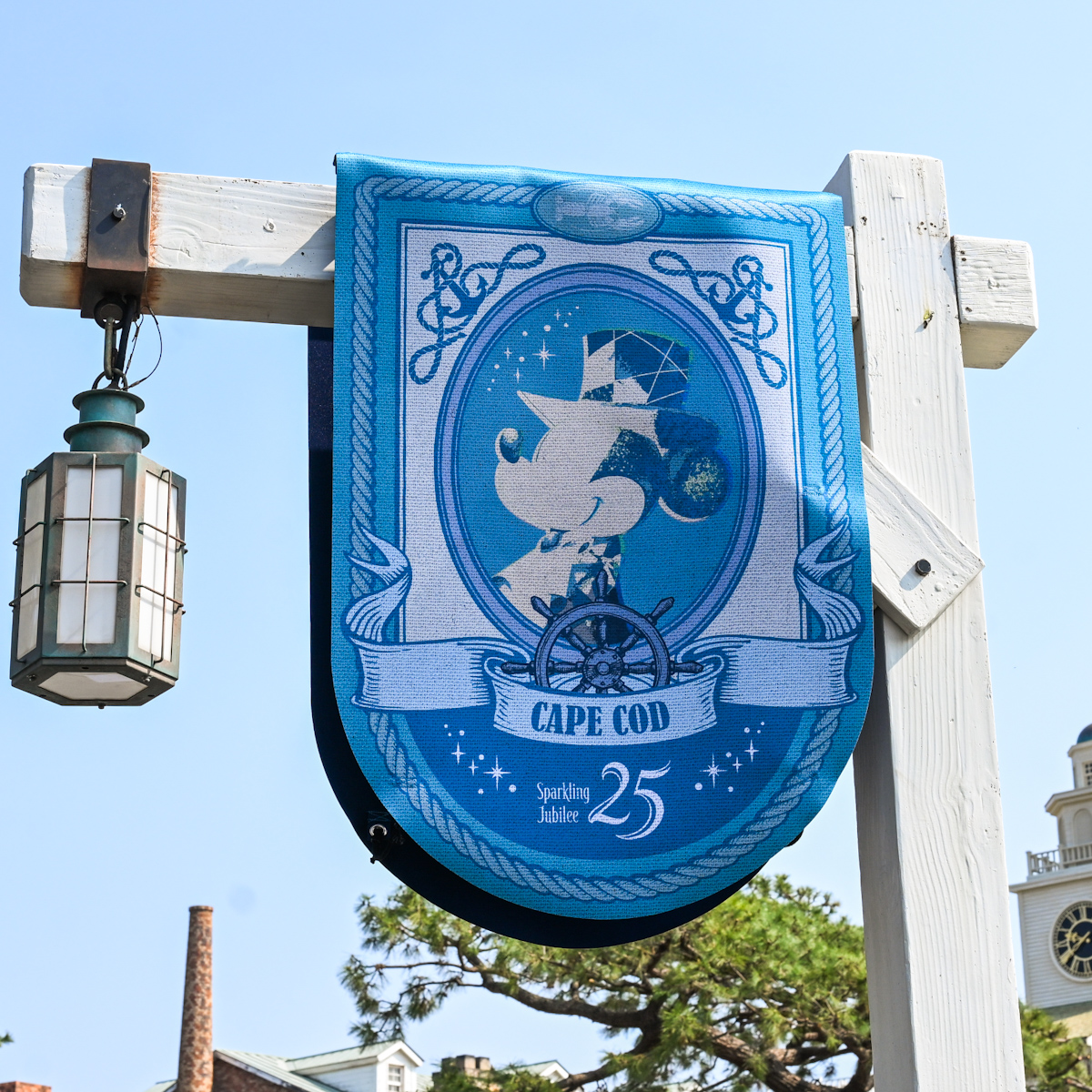 アメリカンウォーターフロントにあるケープコッドには舵や錨、ロブスターなどデザインされたミッキー、ミニー、25周年のバナーが登場しています。