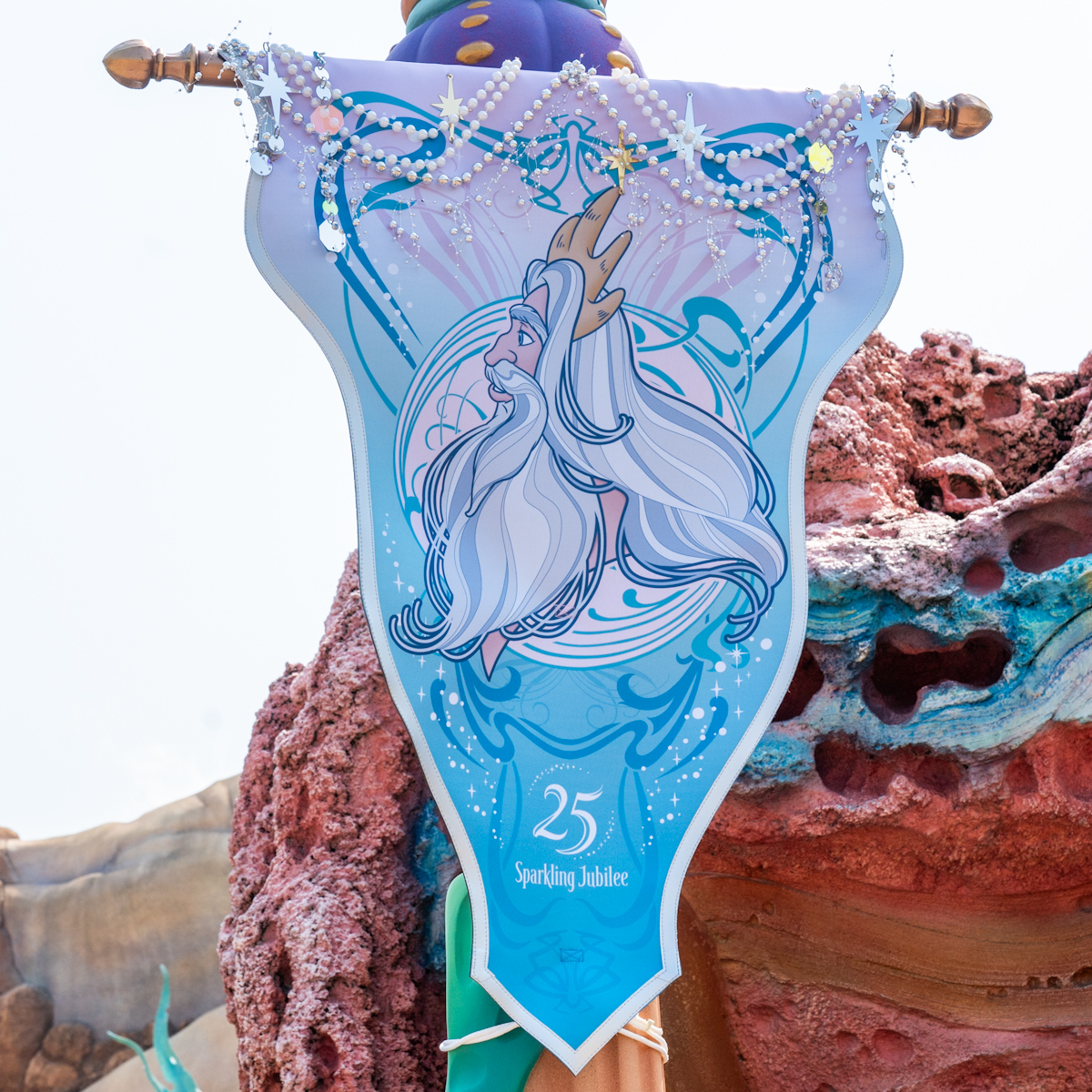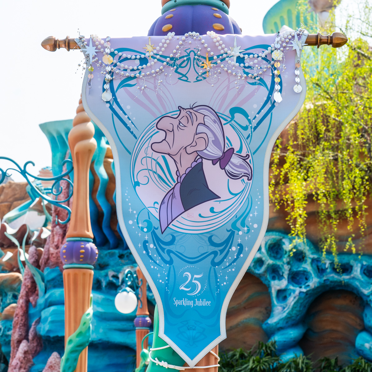 マーメイドラグーンのキング・トリトン・キャッスルの周辺には、アリエルやフランダー、トリトン王、セバスチャン、エリック王子、グリムズビー、シェフ・ルイたちのバナー。