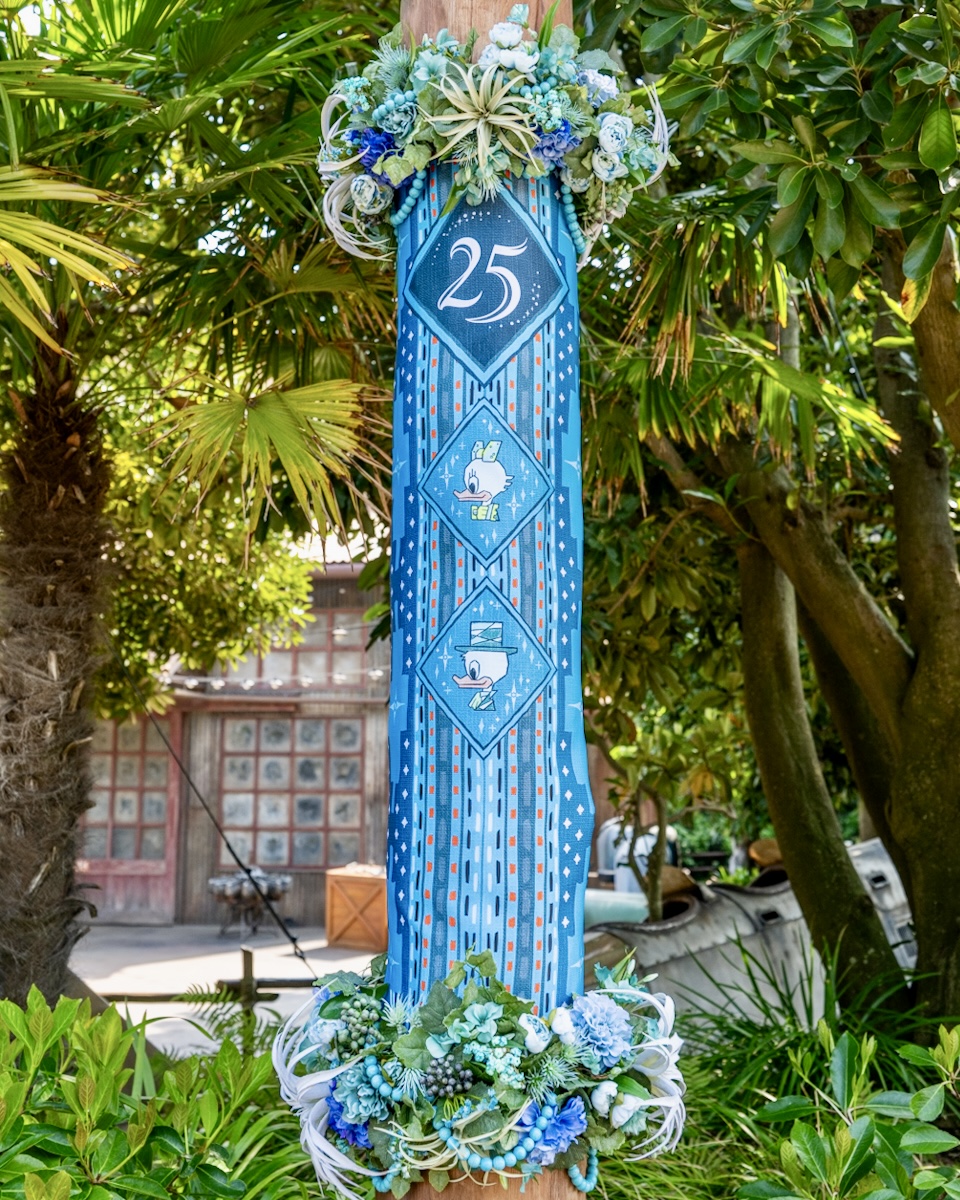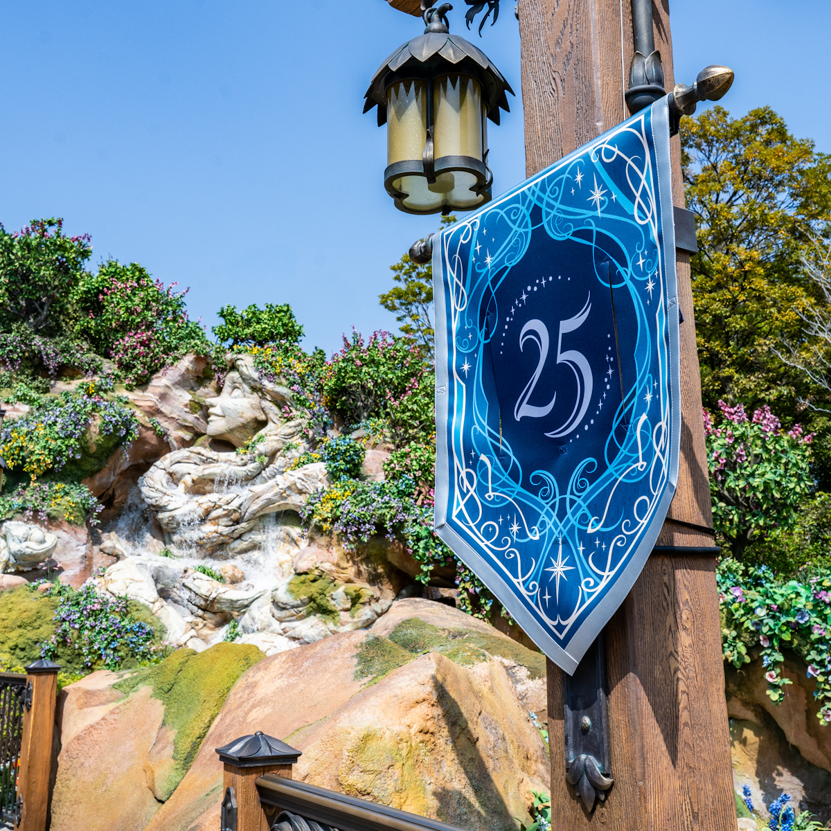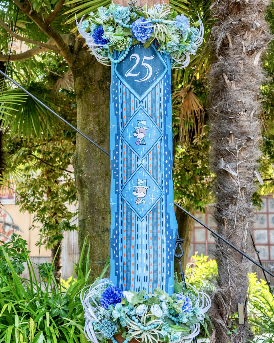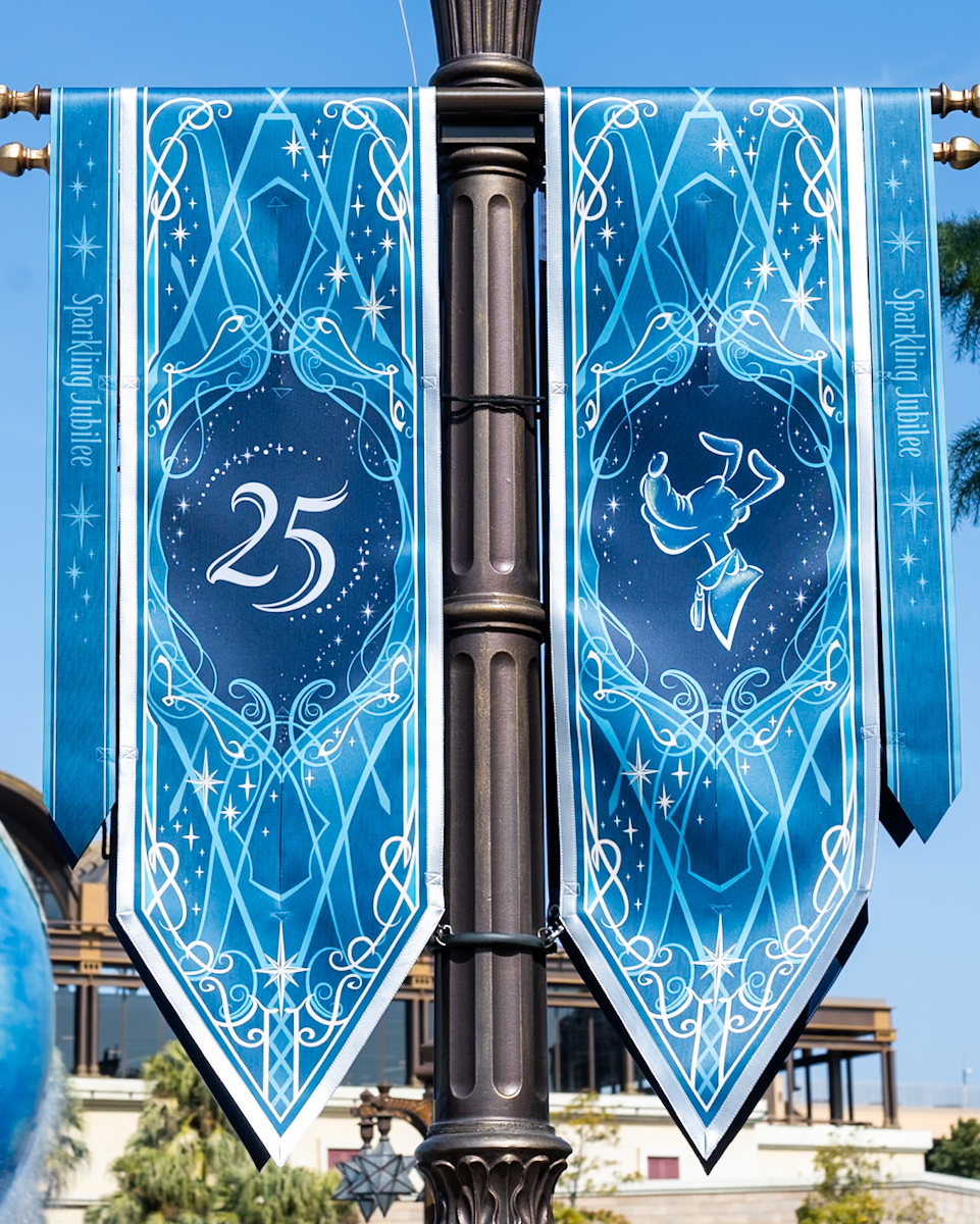 ピーター・パンやティンカー・ベル、アナとエルサ、オラフ、ラプンツェルやパスカルの魔法の泉があるファンタジースプリングス・エントリーウェイ周辺に、25周年のロゴがデザインされたバナーが飾られています☆