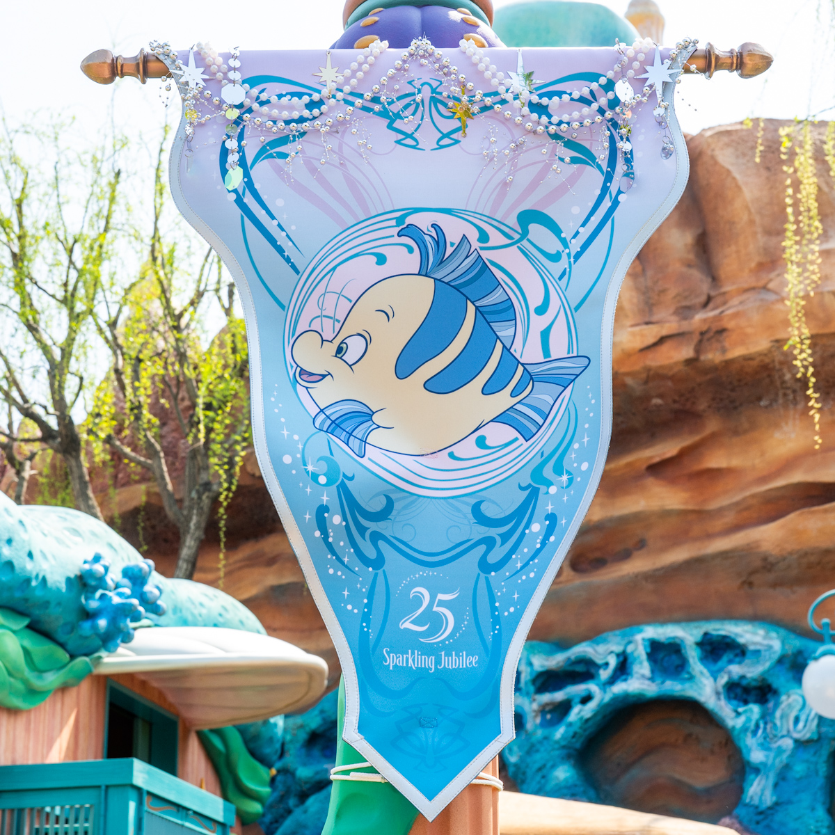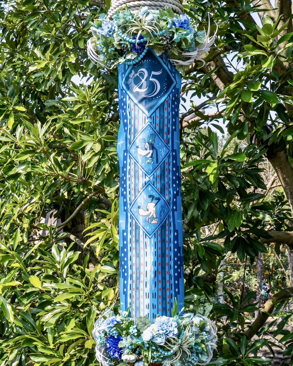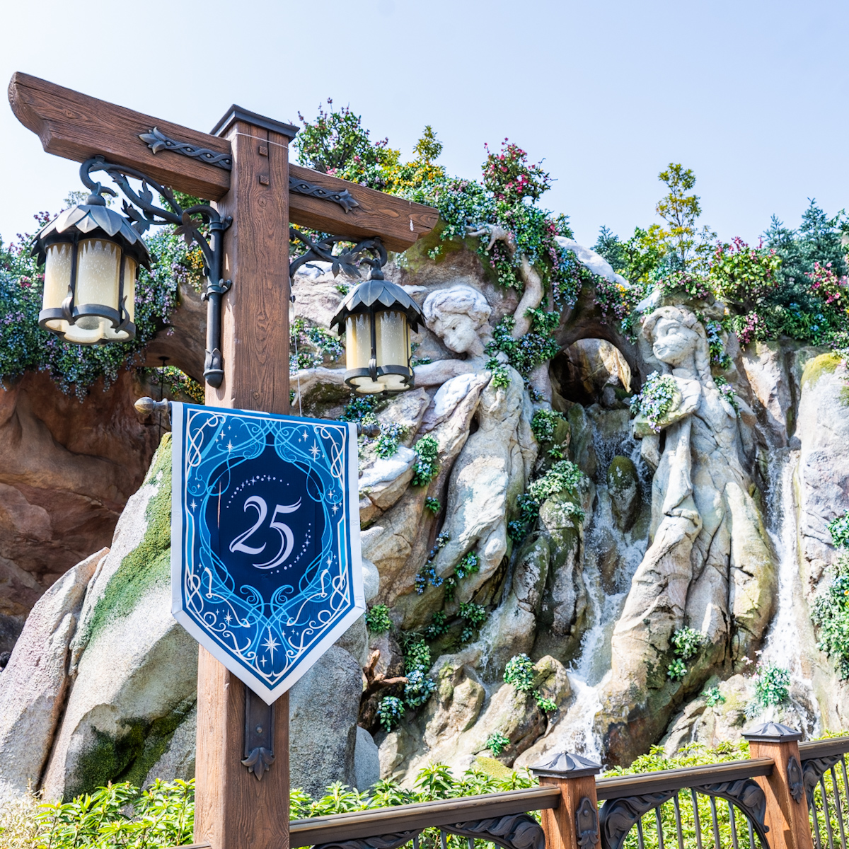 ピーター・パンやティンカー・ベル、アナとエルサ、オラフ、ラプンツェルやパスカルの魔法の泉があるファンタジースプリングス・エントリーウェイ周辺に、25周年のロゴがデザインされたバナーが飾られています☆