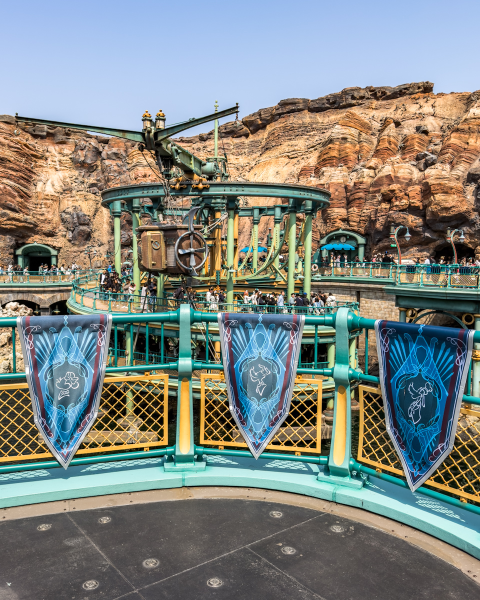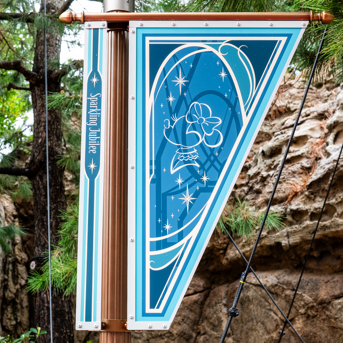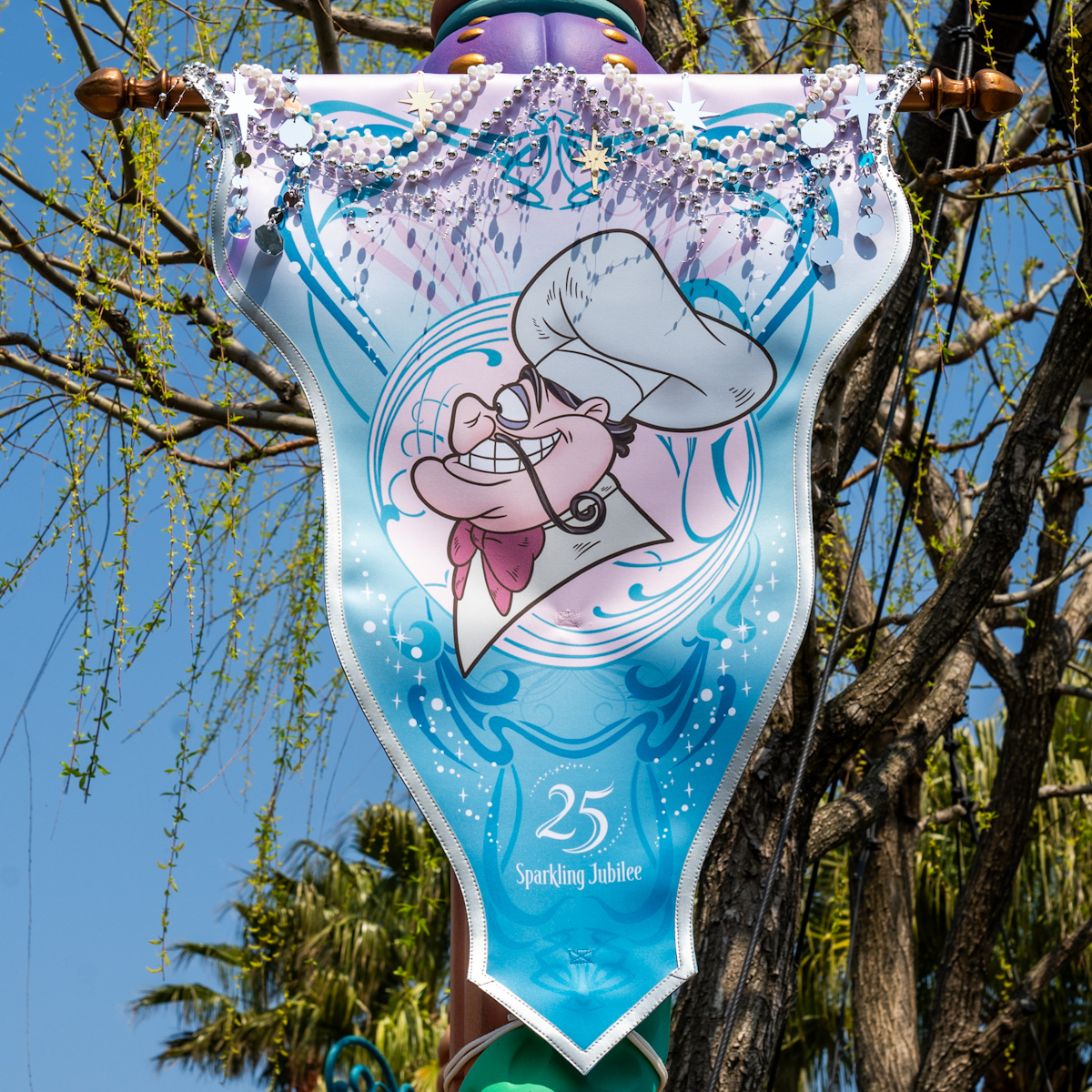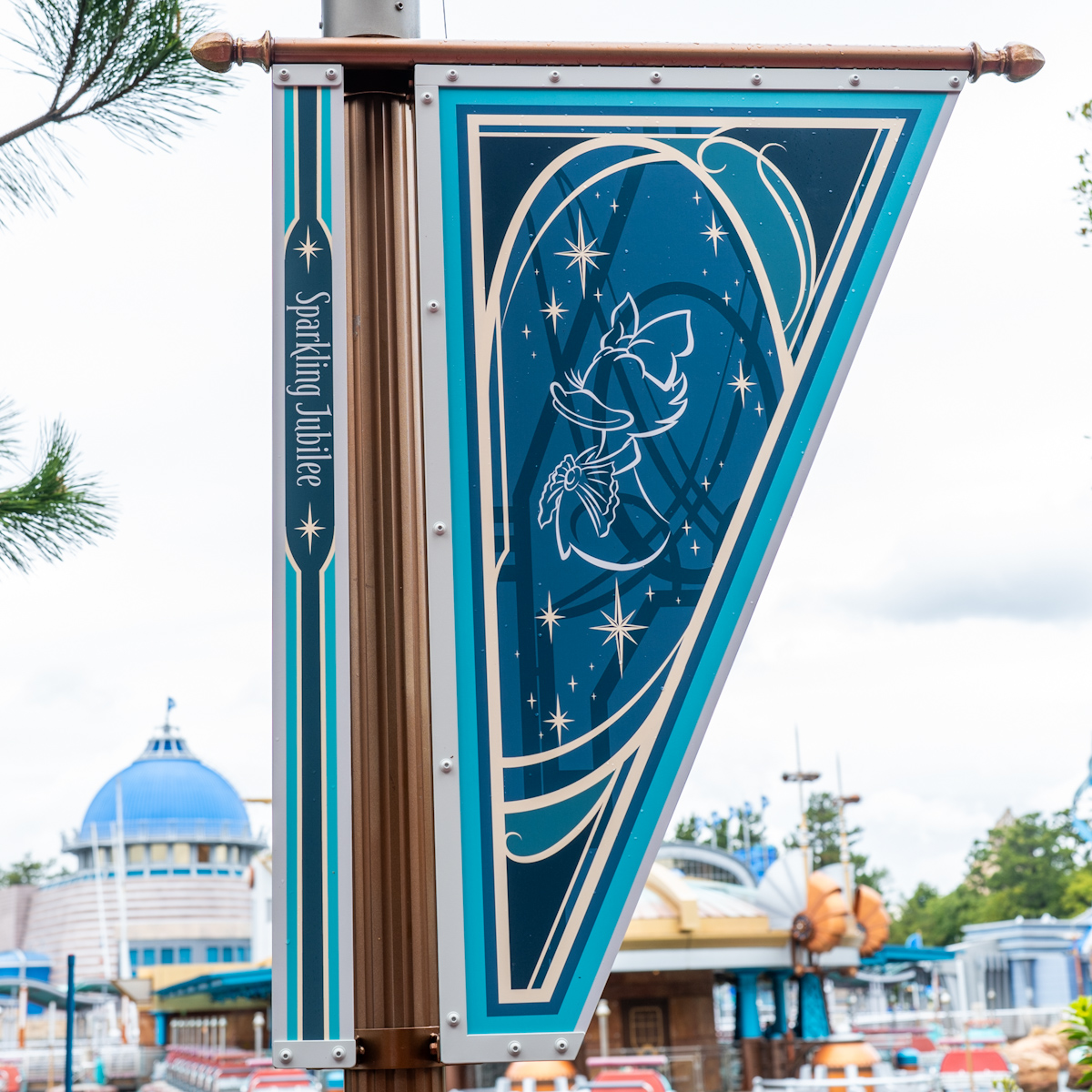 ピーター・パンやティンカー・ベル、アナとエルサ、オラフ、ラプンツェルやパスカルの魔法の泉があるファンタジースプリングス・エントリーウェイ周辺に、25周年のロゴがデザインされたバナーが飾られています☆