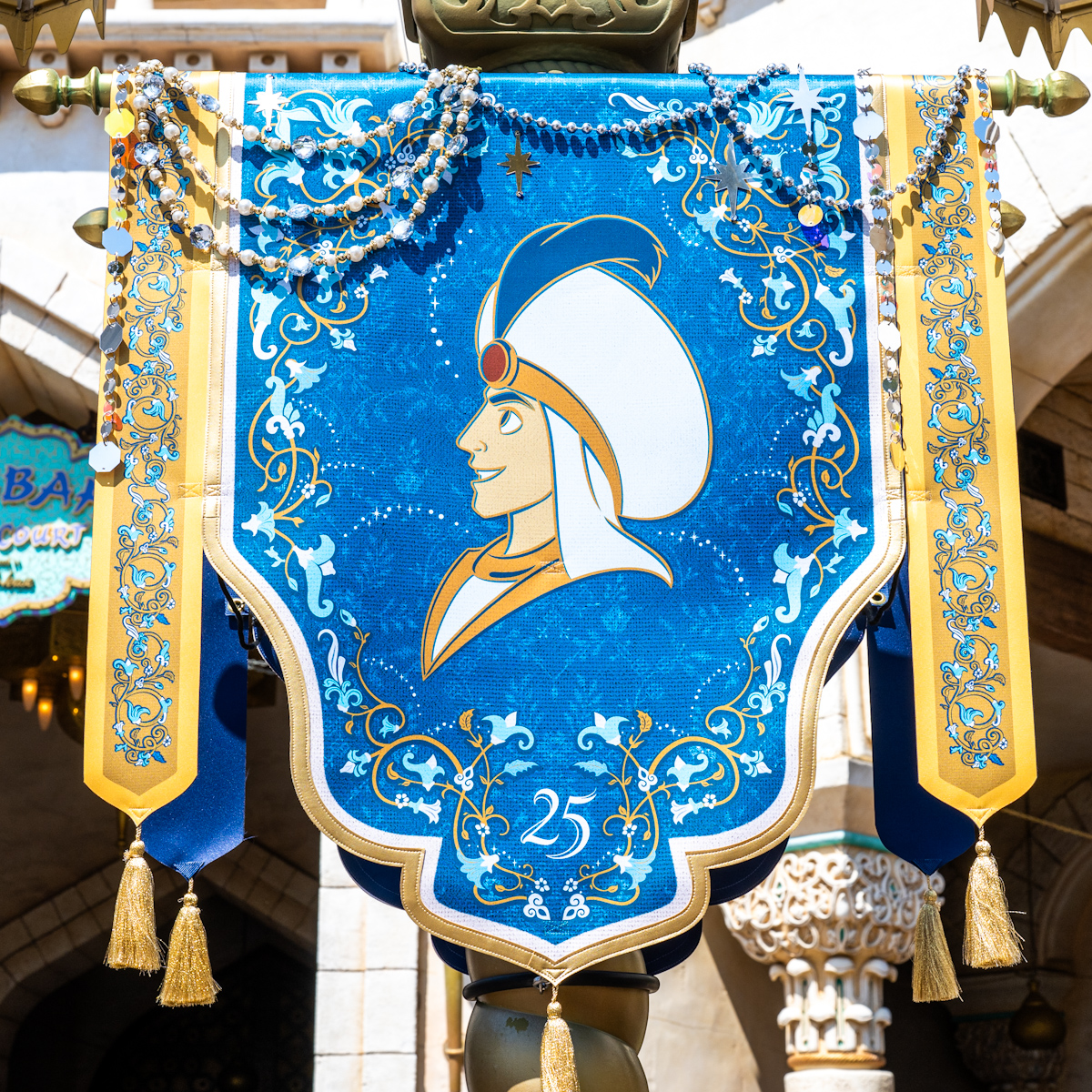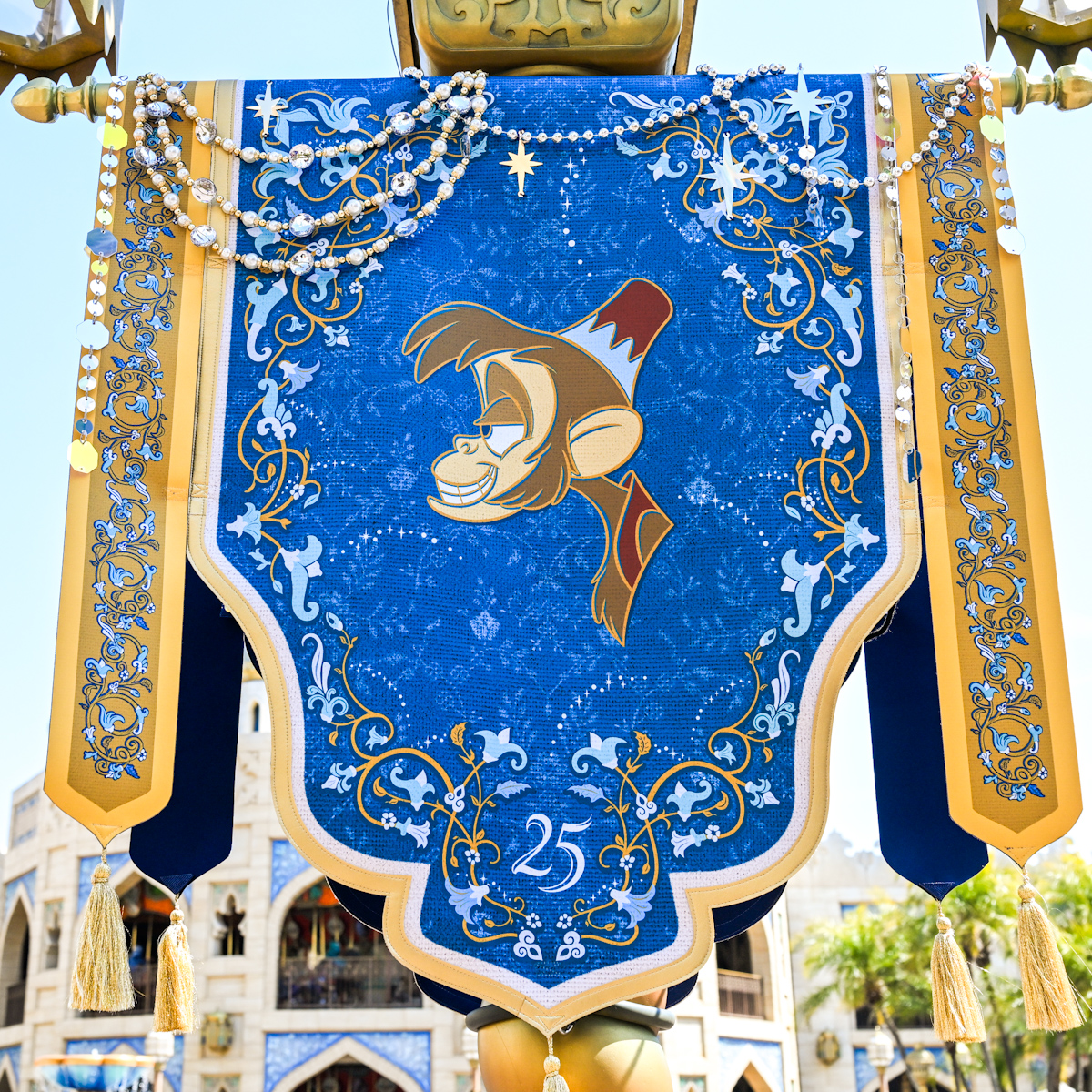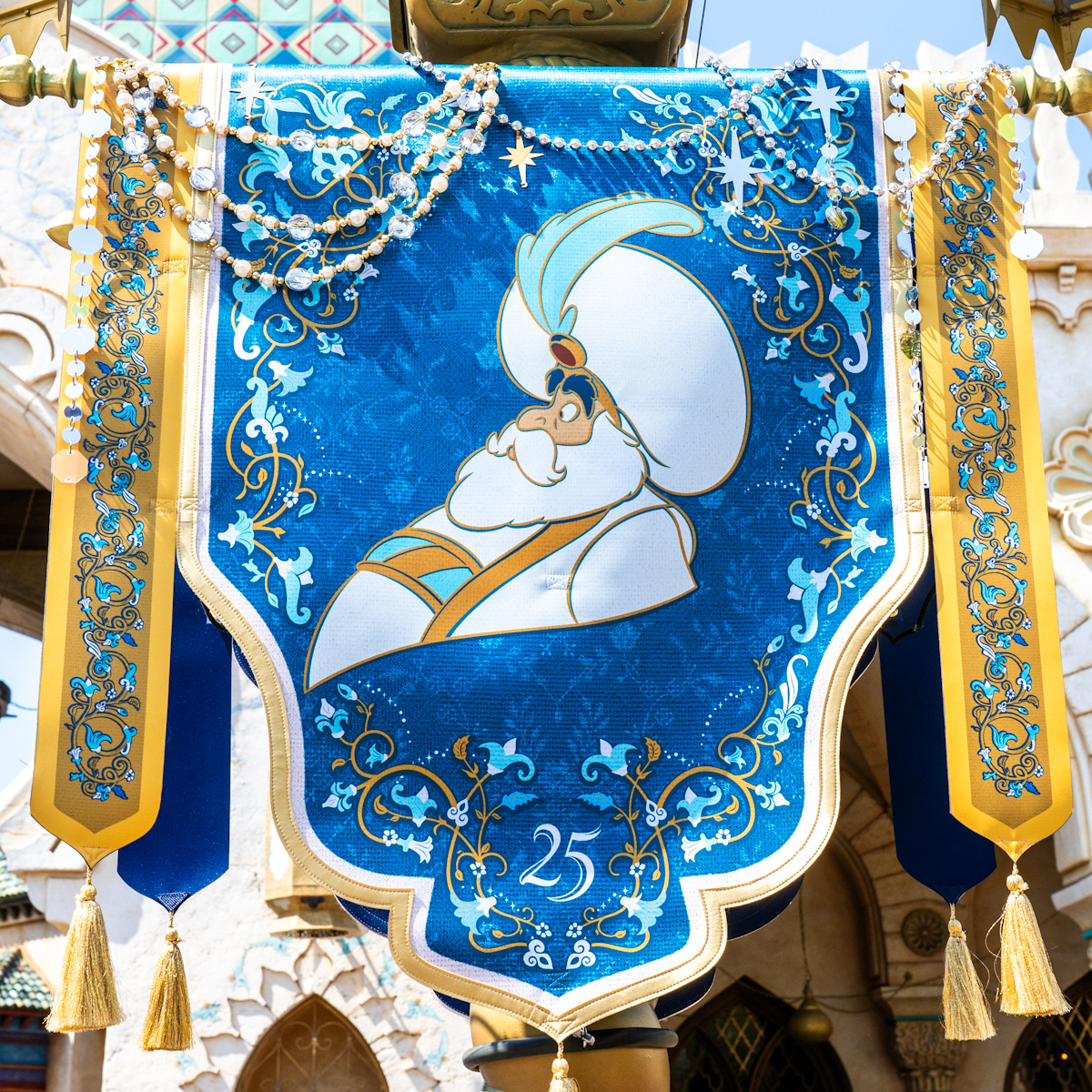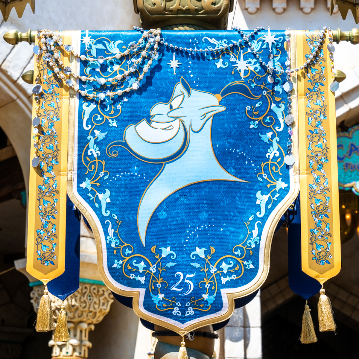 アラビアンコーストには、アラジン、アブー、ジャスミン、ラジャー、サルタン、ジーニーたちがデザインされた豪華なバナーが登場しています。