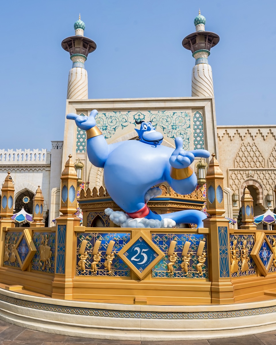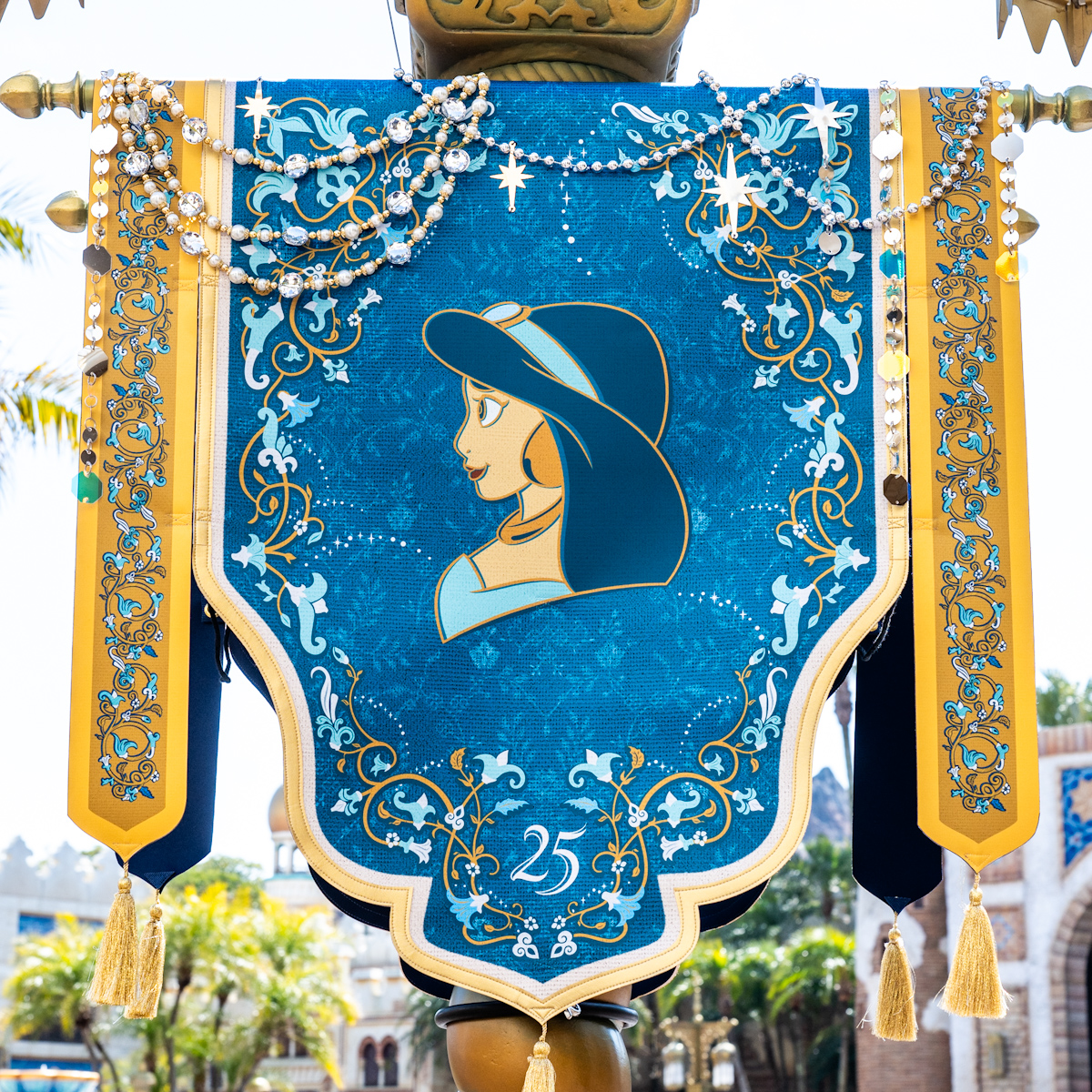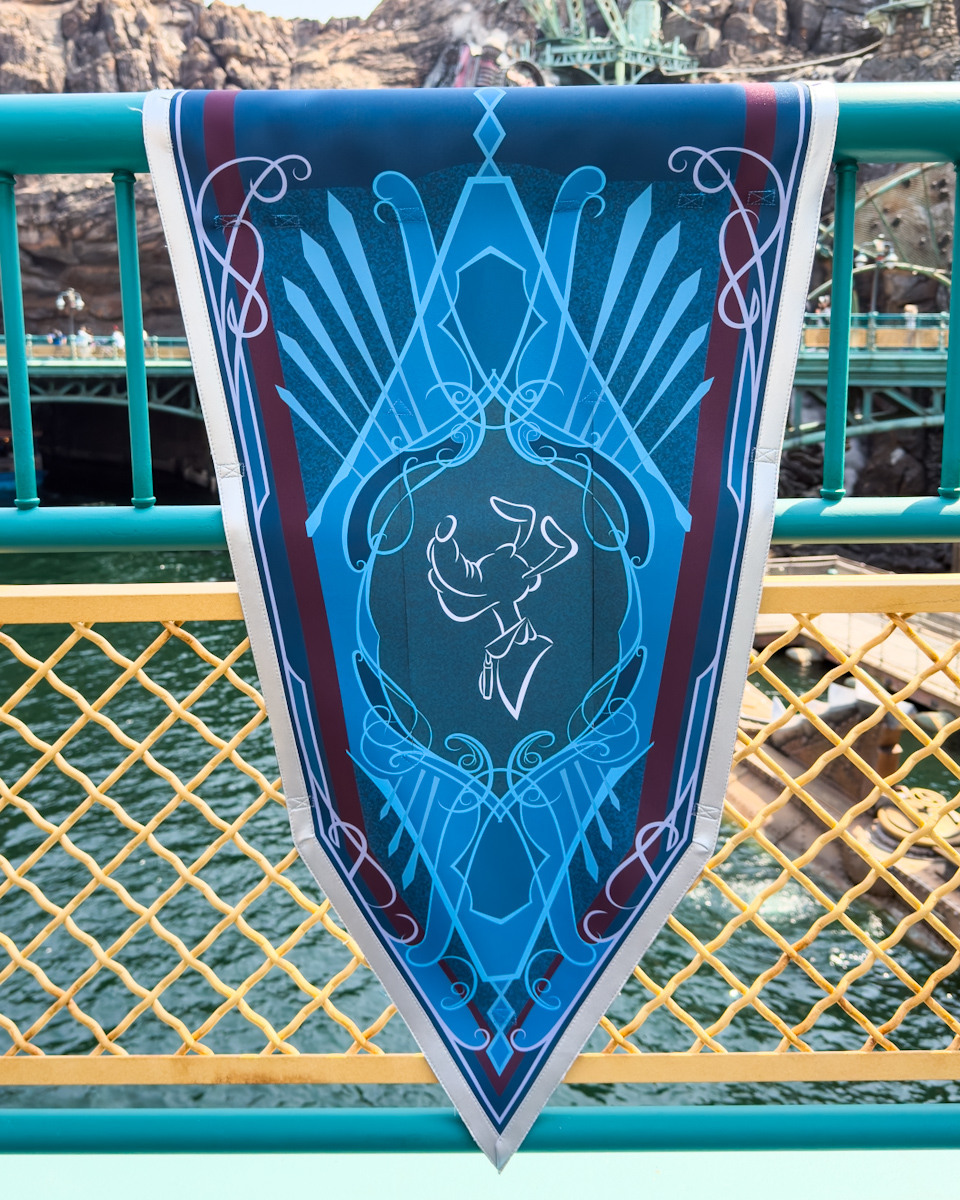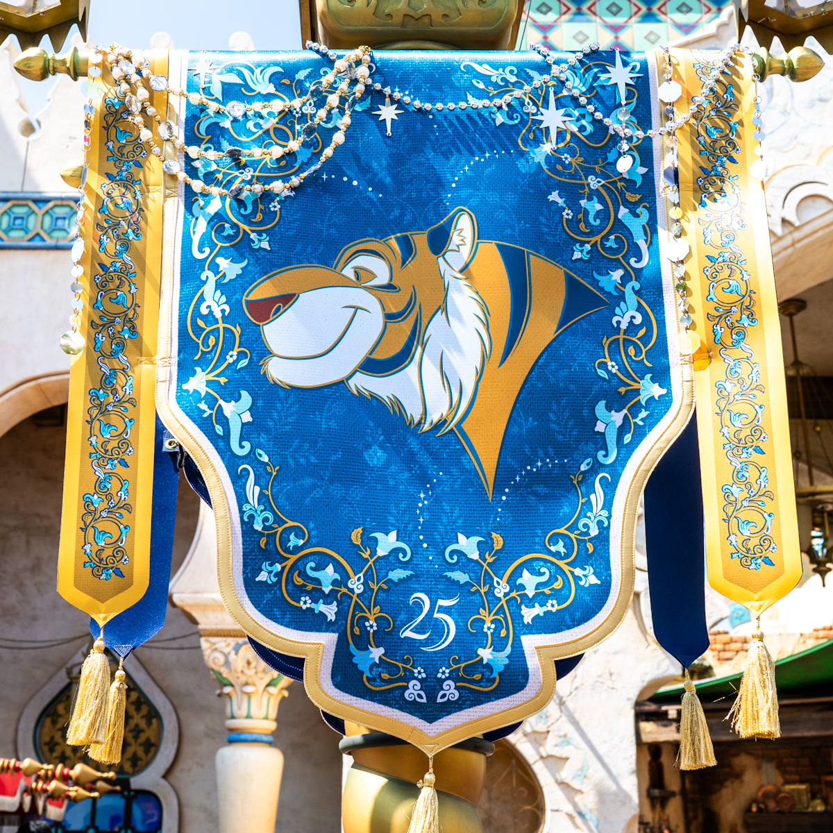 アラビアンコーストには、アラジン、アブー、ジャスミン、ラジャー、サルタン、ジーニーたちがデザインされた豪華なバナーが登場しています。