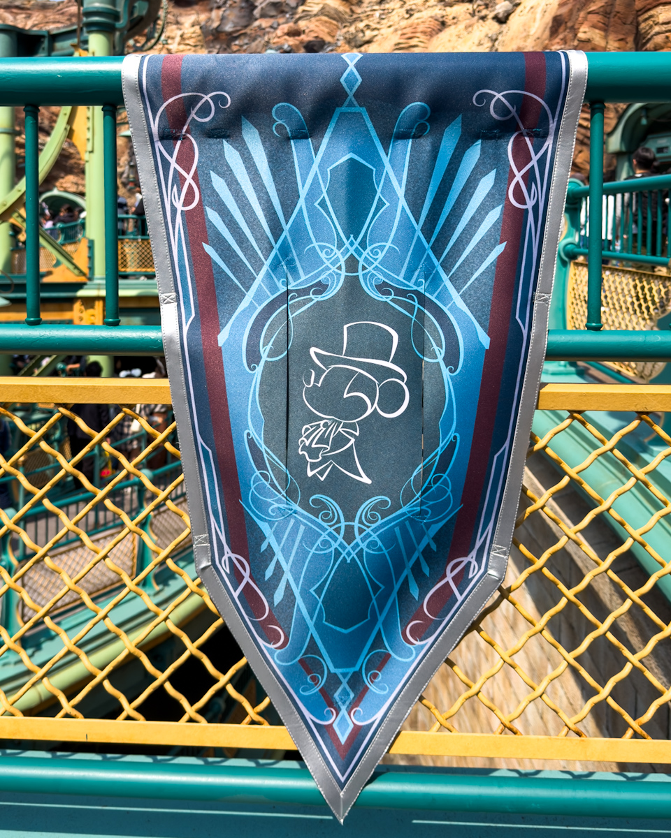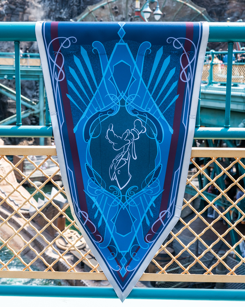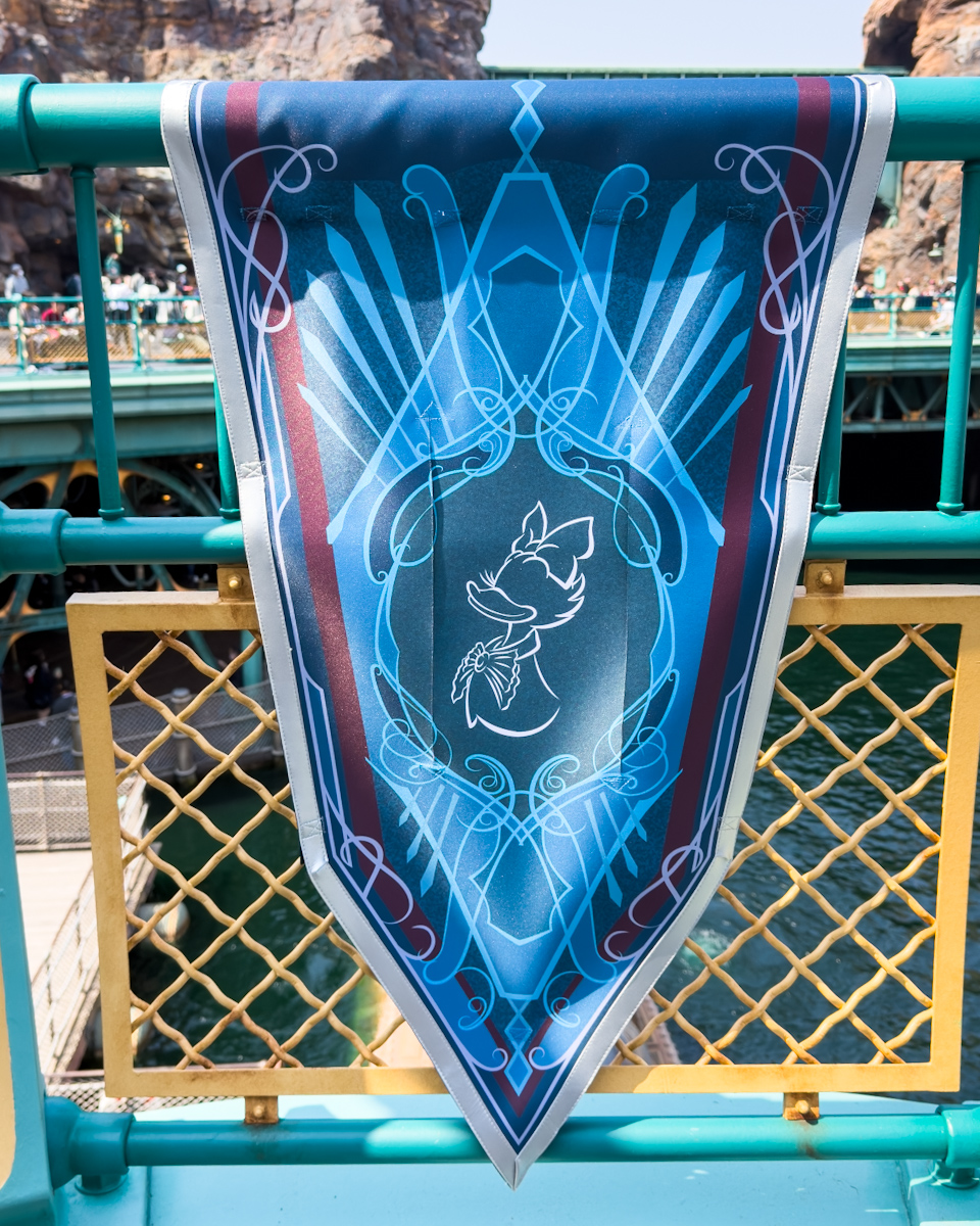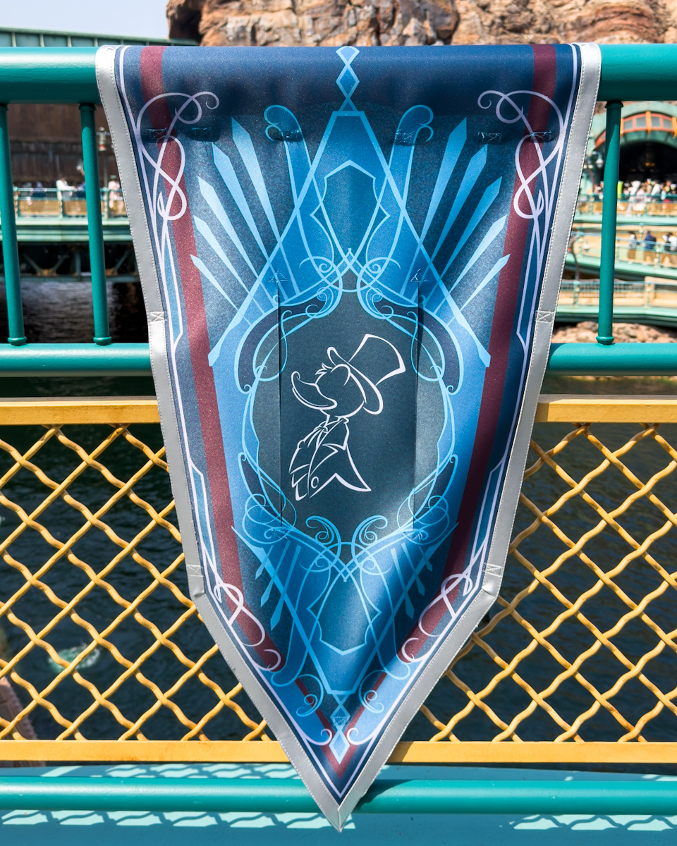 アラビアンコーストには、アラジン、アブー、ジャスミン、ラジャー、サルタン、ジーニーたちがデザインされた豪華なバナーが登場しています。