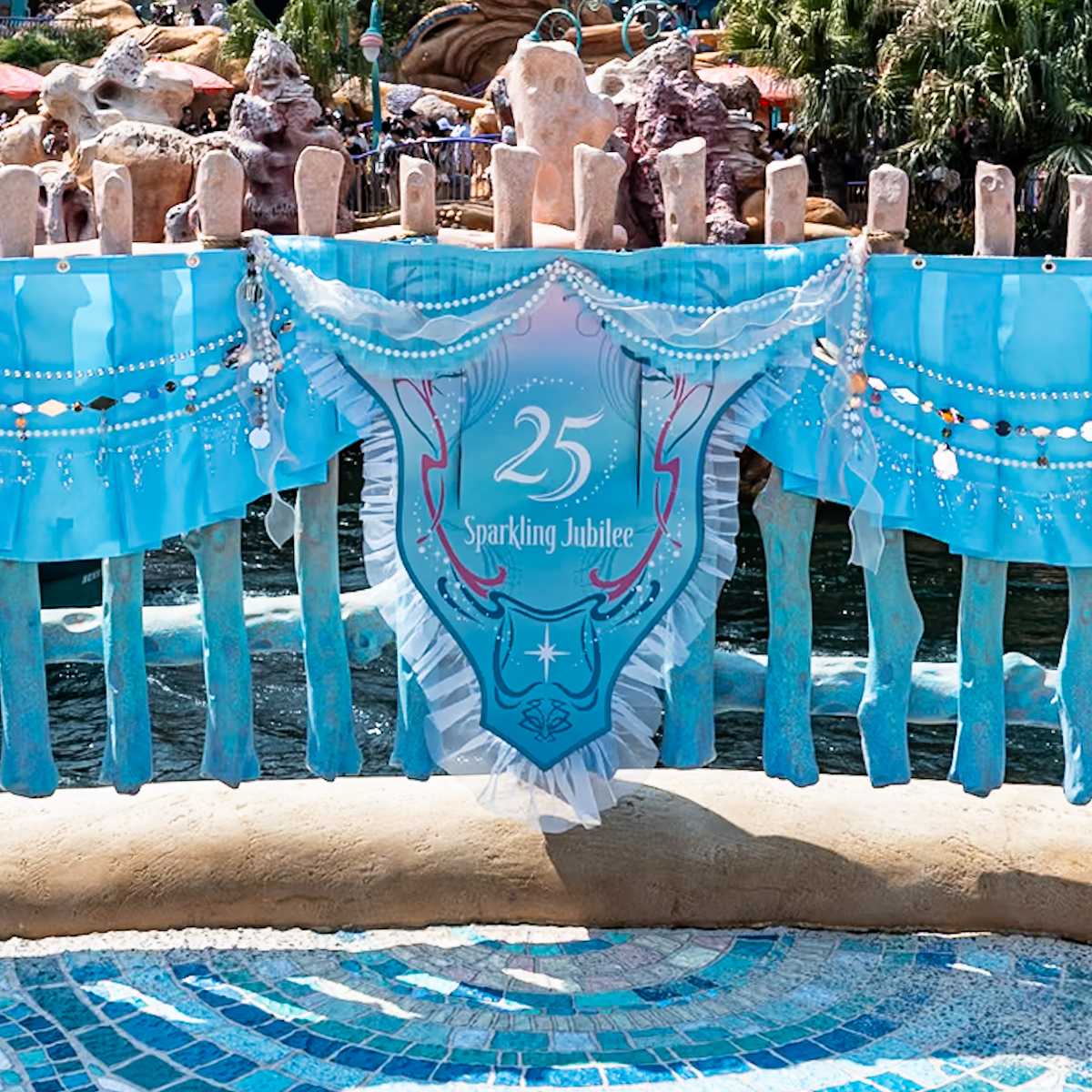ミラコスタ下も25周年のロゴとジュビリーブルーの装飾。