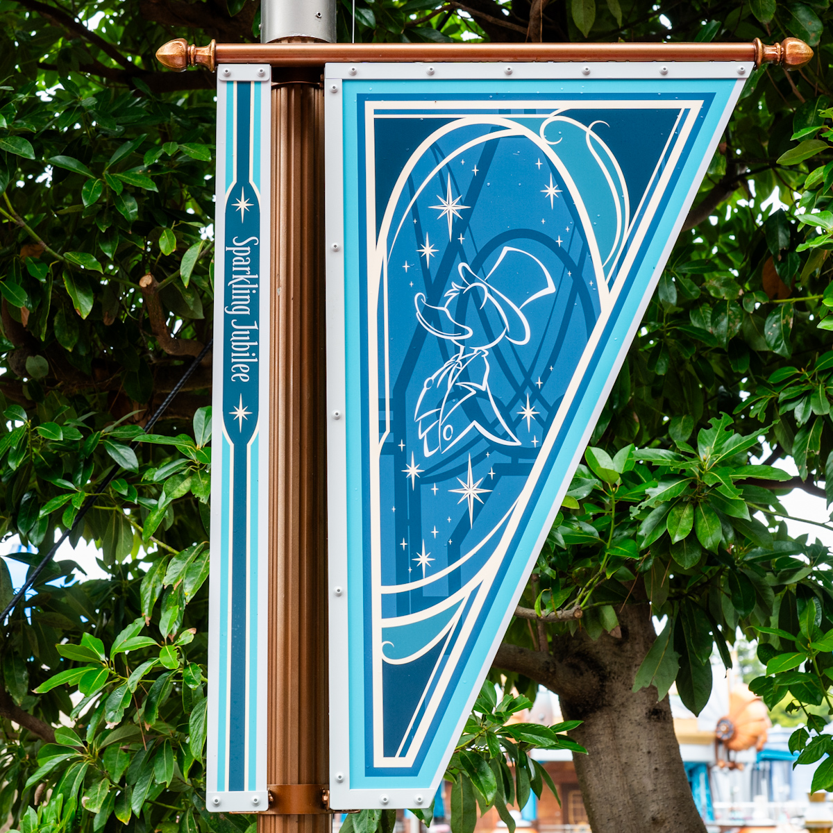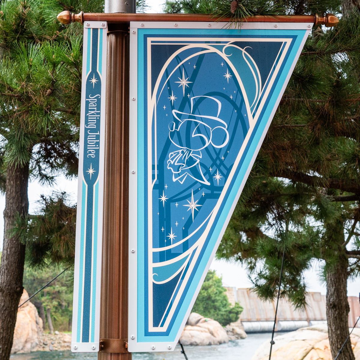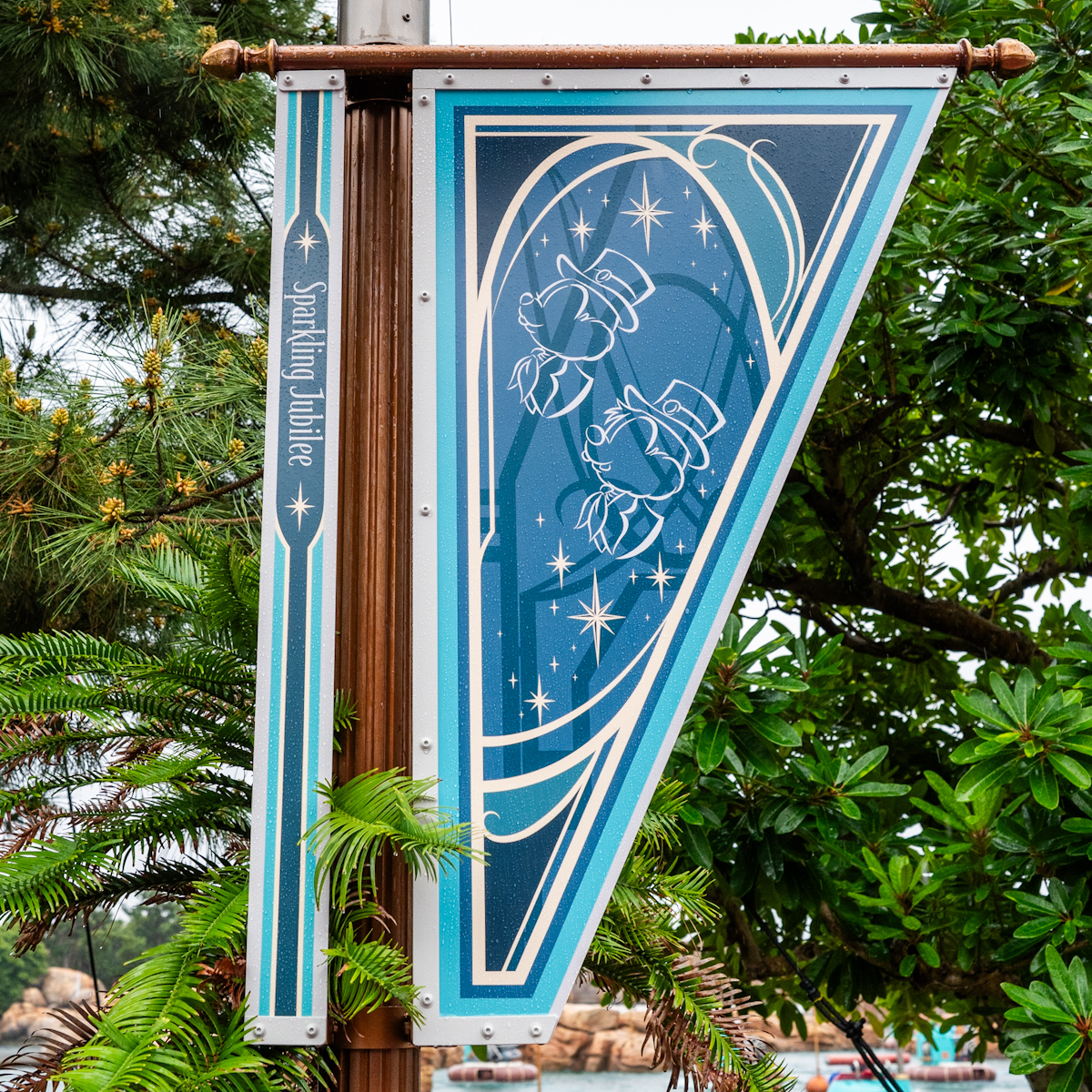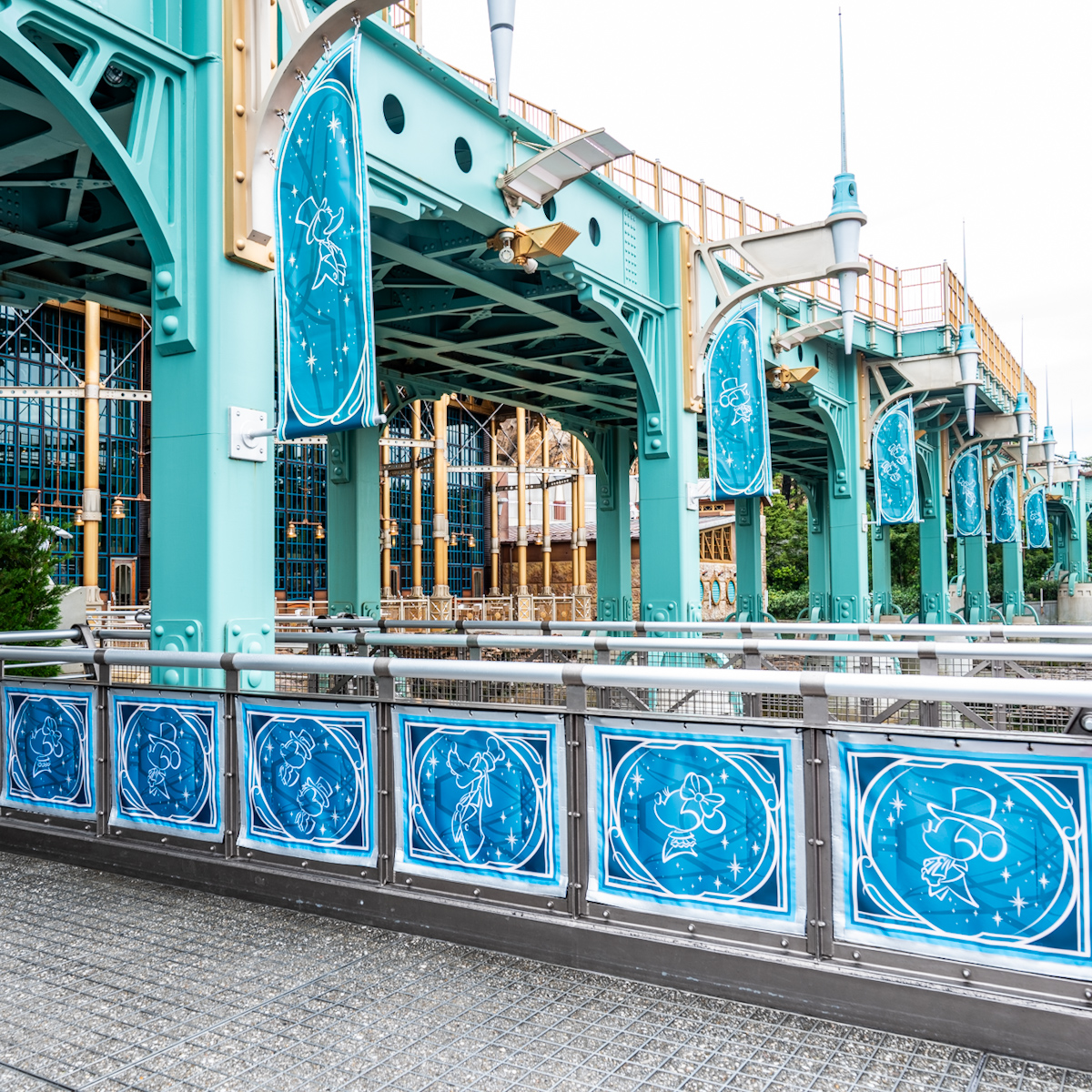 ジュビリーブルーにミッキー&フレンズのシルエットがデザインされたバナーがたくさん飾られています。