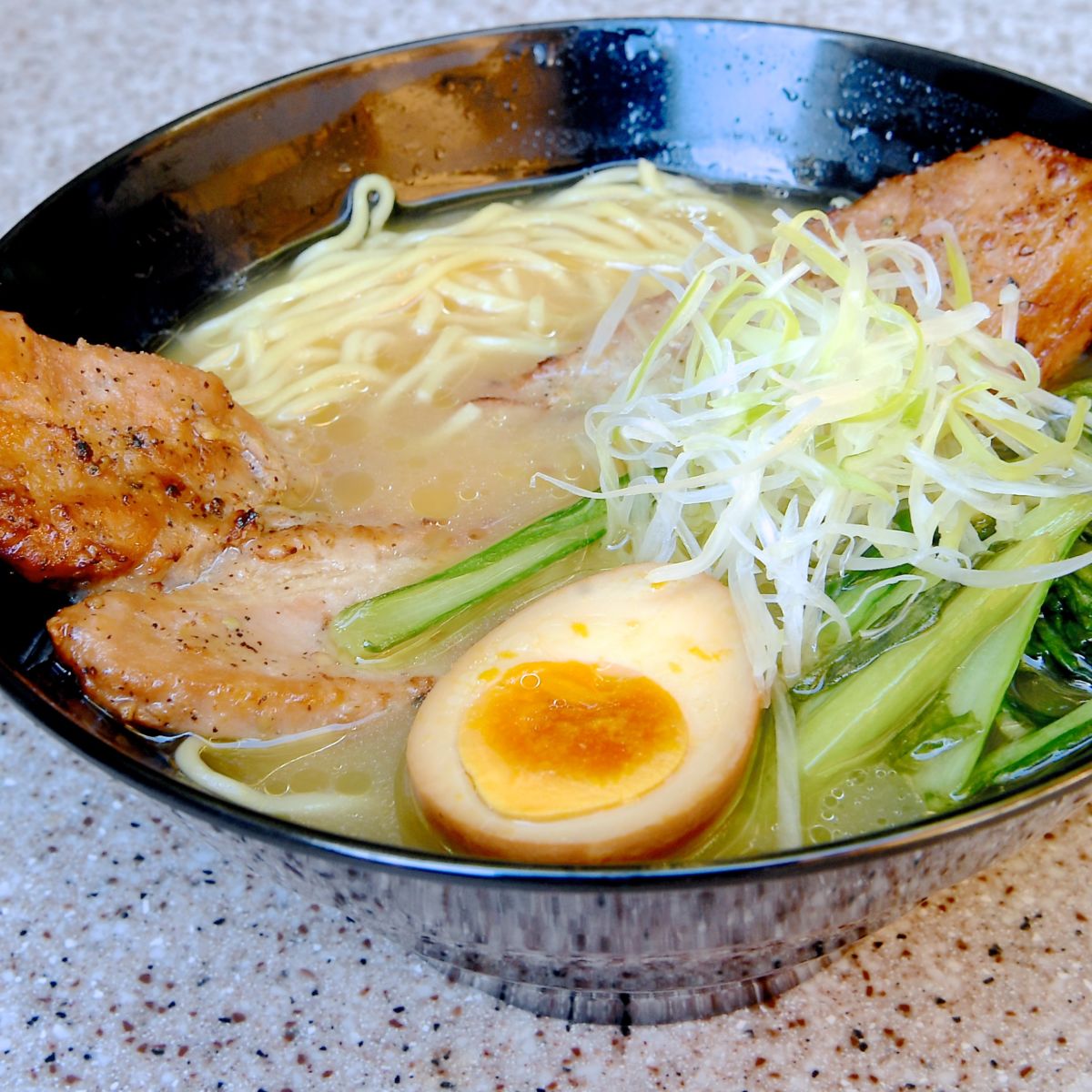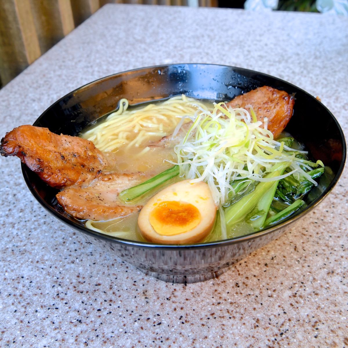 豚骨醤油味のラーメンに肉厚でスパイシーなブラックペッパーポークがトッピングされています☆