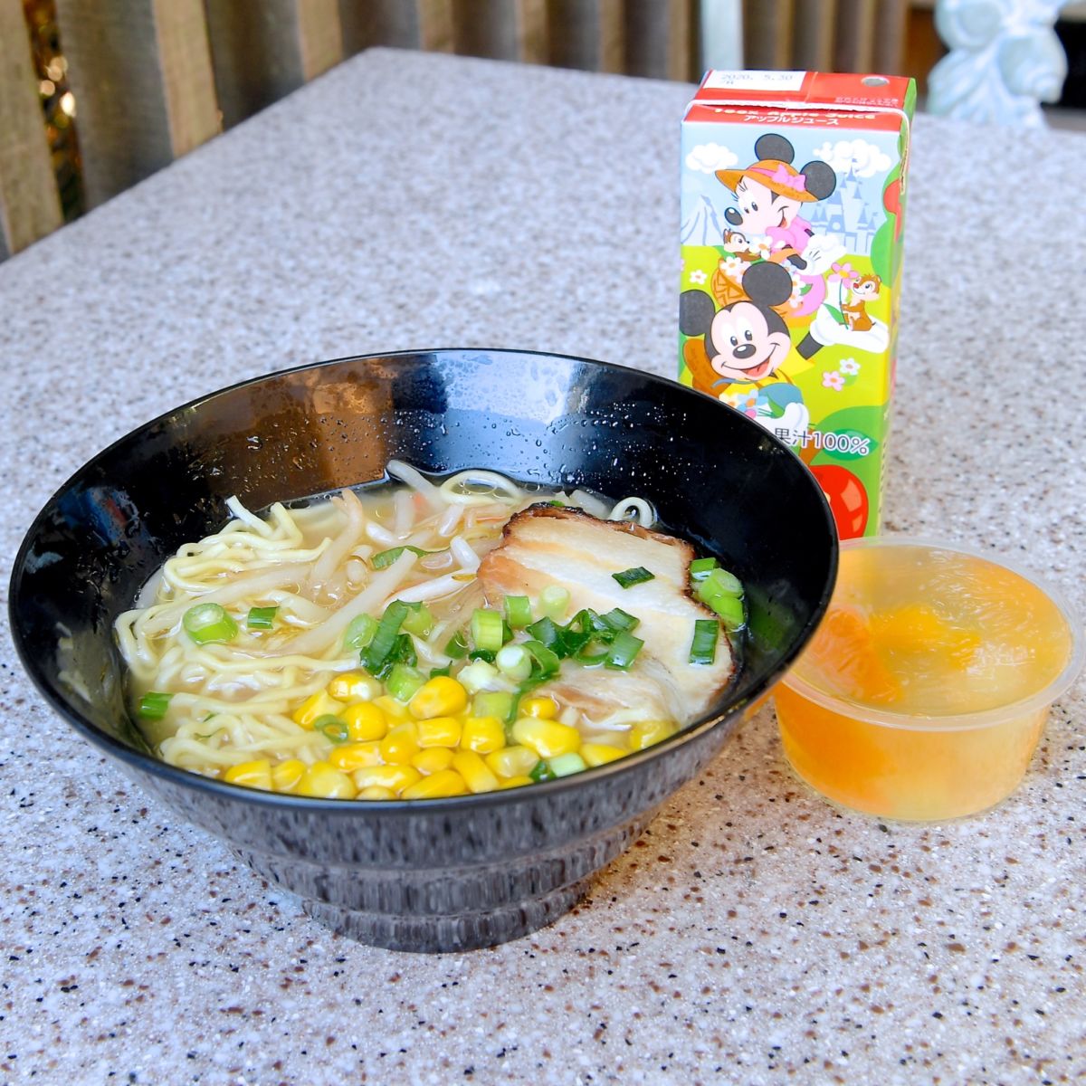 スープヌードル、フルーツゼリー、アップルジュースのセット。