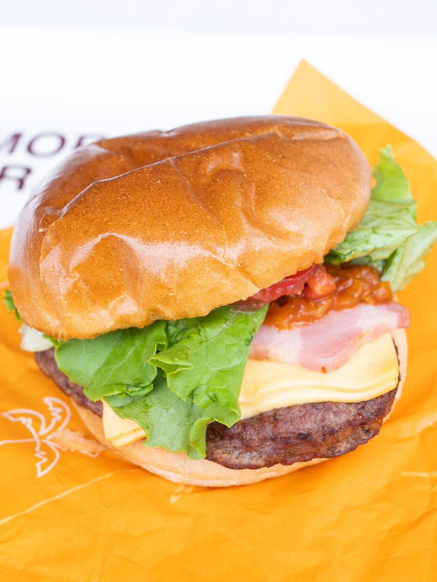 ベーコン、レタス、トマトがサンドされたハンバーガー。