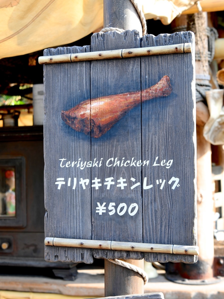 お肉の食べ歩きメニューは東京ディズニーランドでは「チャックワゴン」の「スモークターキーレッグ」とこちらの「テリヤキチキンレッグ」が提供されています。